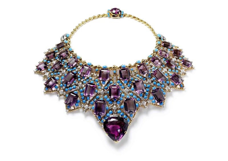 1947年溫莎公爵託付卡地亞為夫人設計一條充滿異國風情的項鍊,以黃金、白金、紫水晶及綠松石等珍貴寶石所組成,也是Cartier展現其風格特色的指標性作品之一。