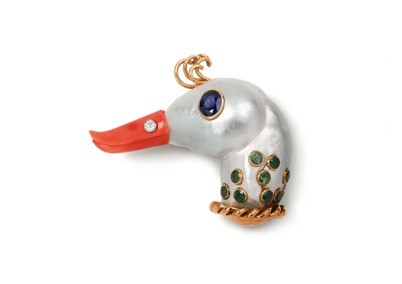 總是能將動物表現得維妙維肖又獨具風格,也以動物造型珠寶為品牌開創一片天地的Cartier,除了為同樣也喜歡動物的溫莎公爵夫人打造美洲豹胸針之外,爾後陸續還設計了以黃金、鉑金、珍珠、圓形祖母綠及珊瑚為主,橢圓形藍寶石為眼睛的童趣造型鴨子胸針(1953年),和黃金、黑珐瑯、老虎眼睛為祖母綠的老虎長柄眼鏡。