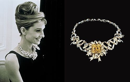 奧黛莉赫本在第五大道Tiffany & Co.精品店櫥窗前,吃甜甜圈喝咖啡,從櫥窗外望著裡頭的珠寶說著:「在那兒吃早餐不會不愉快!」劇情中出現的128.54克拉枕形明亮式切割黃鑽緞帶項鍊,正是出自Tiffany之手,那一顆Tiffany黃鑽至今一直都是為紐約總店的鎮店之寶。