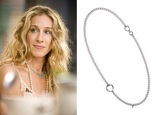 電影版慾望城市裡,取代凱莉的Carrie字母項鍊是Mikmimoto珍珠的歌劇式長鍊。雙釦頭的設計,長鍊其實還可以變成雙串鍊、Y字鍊等十多種配戴方法。