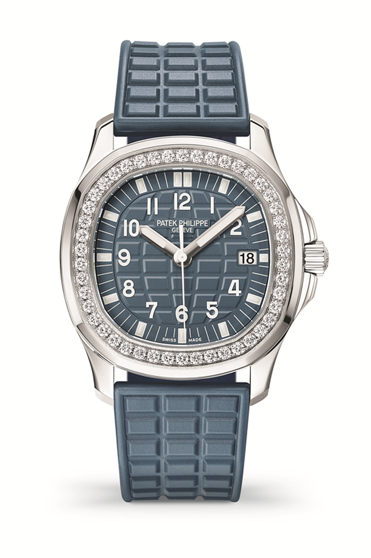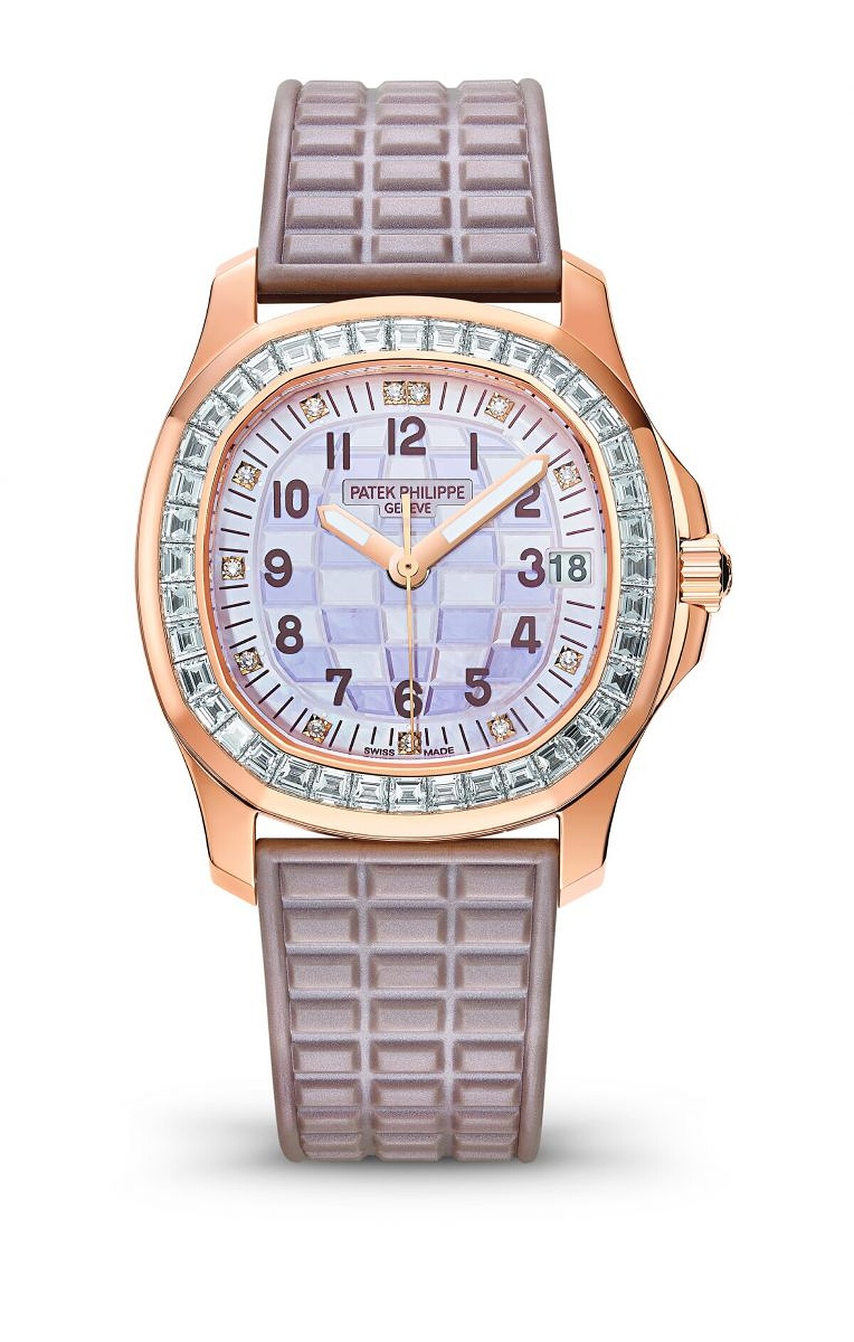Aquanaut Luce高級珠寶腕錶最顯眼的設計特色在珍珠母貝錶面,以兩種米色構成了獨特的棋盤紋理,呼應錶帶上的格狀裝飾,錶圈的鑲鑽裝飾,金質棕色塗漆數字和鑽石小時刻度,帶出了運動風格腕錶亦剛亦柔的一面。