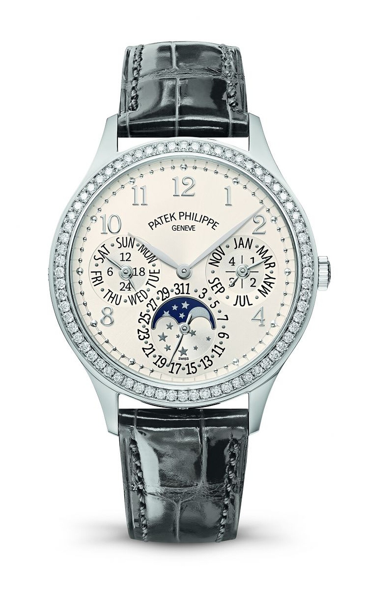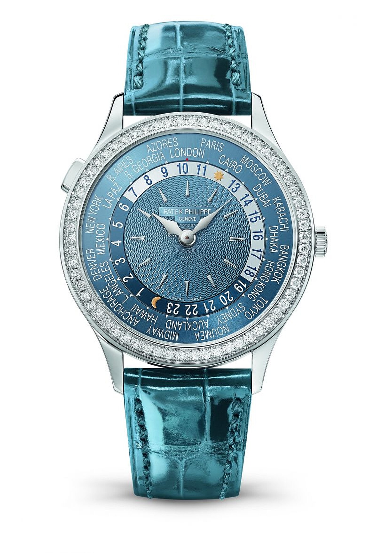 可顯示全球24個時區的日、夜時間,這絕對可以說是最實用的功能,配置相當直覺化,非常好判讀。灰藍色的錶面中央裝飾著手工雕刻的交錯籃織圖案,在錶圈閃亮鑽石的襯托下綻放細緻質感的優雅色調。