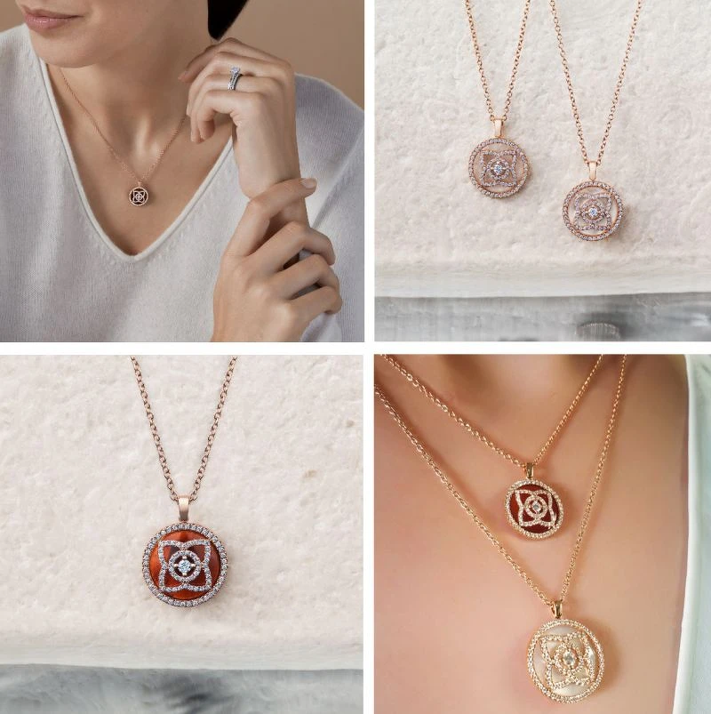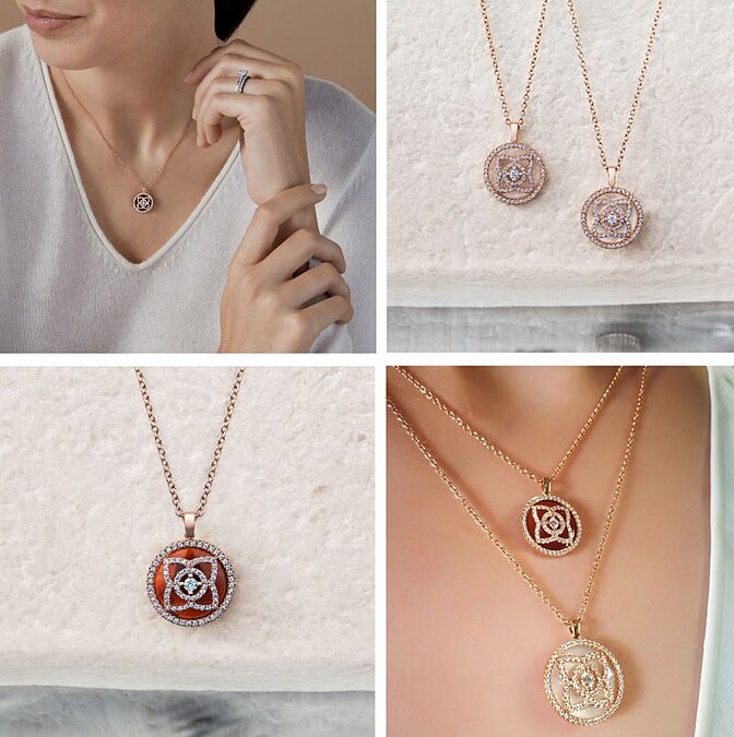 以鑽石搭配藍色青金石、紅瑪瑙、黑碧璽、珍珠母貝或甚至是玉……等多款不同寶石鑲嵌,豐富的色澤呈現了多種不同個性與風格。最喜歡的就是可以層次搭配,單獨佩戴與長短層次佩戴,甚至是長鍊都能讓服裝造型更添精緻度。因為精湛的工藝,所以細膩閃耀的光芒即使搭配淺色服裝,都不會讓項鍊風采被搶走,此外,在翻轉至背面後依舊美麗、露出一顆雋永低調的單鑽,是最讓人感到驚喜的小細節。