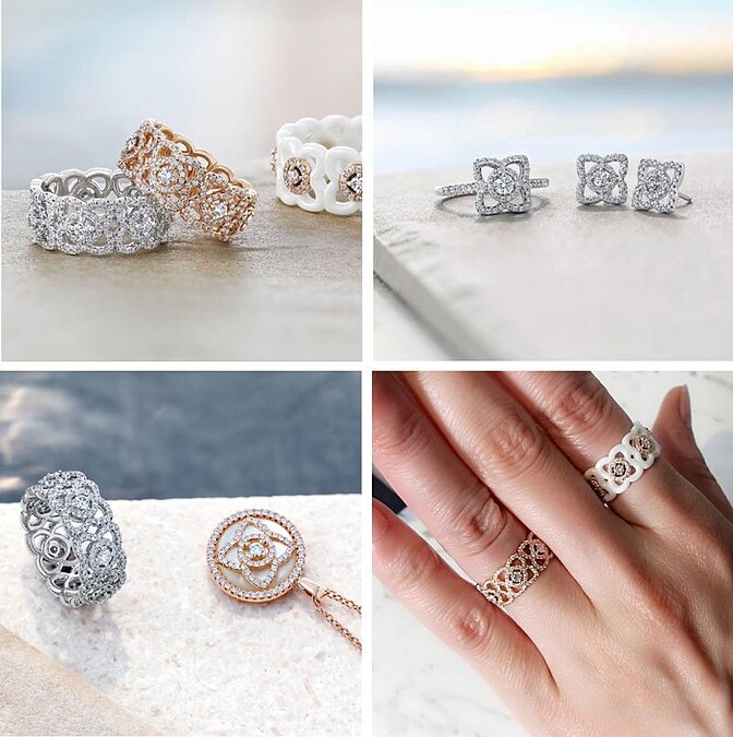 白金、玫瑰金密釘鑲嵌美鑽戒環,因為精湛工藝的加持,即便是奢華輕珠寶也擁有,隨便舉手都能閃出不容忽視的光芒。以18K白金及玫瑰金或黑色、白色陶瓷鑲嵌美鑽,打造出Enchanted Lotus的花瓣圖案。設計十分特別的陶瓷戒環分別有Daylight與Moonlight的名稱,象徵日夜不同的面向,比起白金、玫瑰金貴金屬鏤空鑲嵌美鑽戒環,多出了中性帥氣與都會時髦感,很適合喜愛俐落簡約造型的女生佩戴,一手食指混搭、一手無名指的混搭也非常出眾。