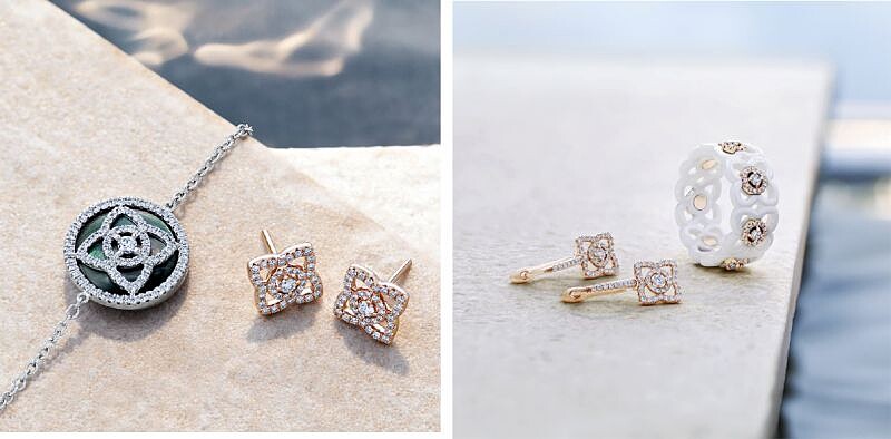 左-Enchanted Lotus白K金灰色珍珠母貝鑽石手鍊,NT84,000、玫瑰金耳釘式鑽石耳環,NT68,000