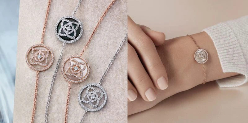纖細的手鍊與鑲嵌美鑽的蓮花圖樣線條,搭配得非常完美,佩戴上自然而然便迸發出優雅氣息,也讓手腕線條顯得更加柔美,偶爾一舉手變閃出細緻耀眼的晶透光芒,即使搭配腕錶或層次佩戴多條輕奢華珠寶手鍊,都能堆砌出低調雅緻的上城女孩風情。