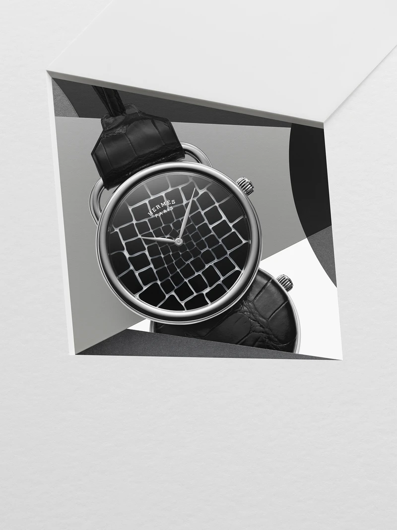 鱷魚鱗紋圖騰的Arceau Pocket Millefiori 懷錶的水晶錶盤,以技術源自十九世紀的千花紙鎮工藝,由聖路易(Saint-Louis)水晶工坊製作。保密到家的礦物質經過混合後,因為化學作用而成了特殊黑色物質,之後再將它混合入熔融的水晶當中。水晶製作大師再以吹鑄技術,將熔化狀態的材質轉化成塊狀。工匠從中拉出細長型的水晶芯柱,然後再切割成數小段。最後,再利用這些長形芯柱組合出所要的圖案。