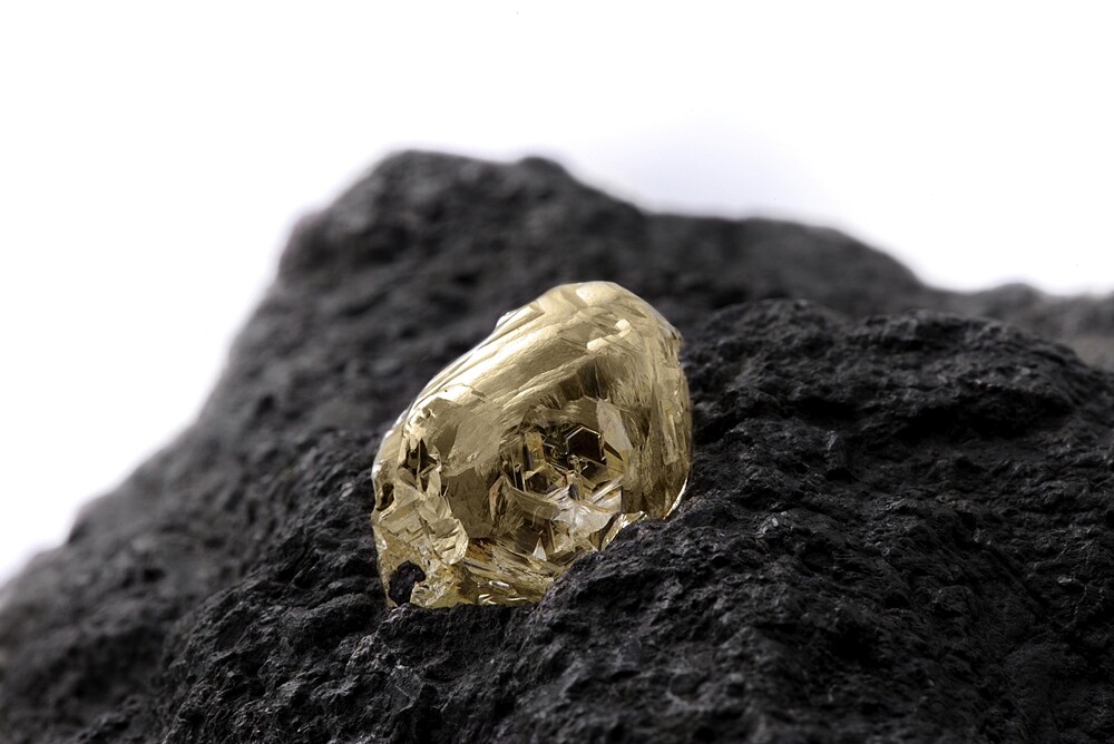 約10億至33億年前,鑽石在地表下逾120公里深處形成,而後因火山爆發才被推升到地面,此過程所產生的火成岩就叫金伯利岩,這是以發源地南非金伯利為名。全球只有15%的金伯利岩能產出鑽石原石,當中又只有1%是品質值得被開採的鑽石。而此次來台展出的金伯利岩總重959.8克,當中藏有一顆約20克拉的鑽石原石,相當珍貴。