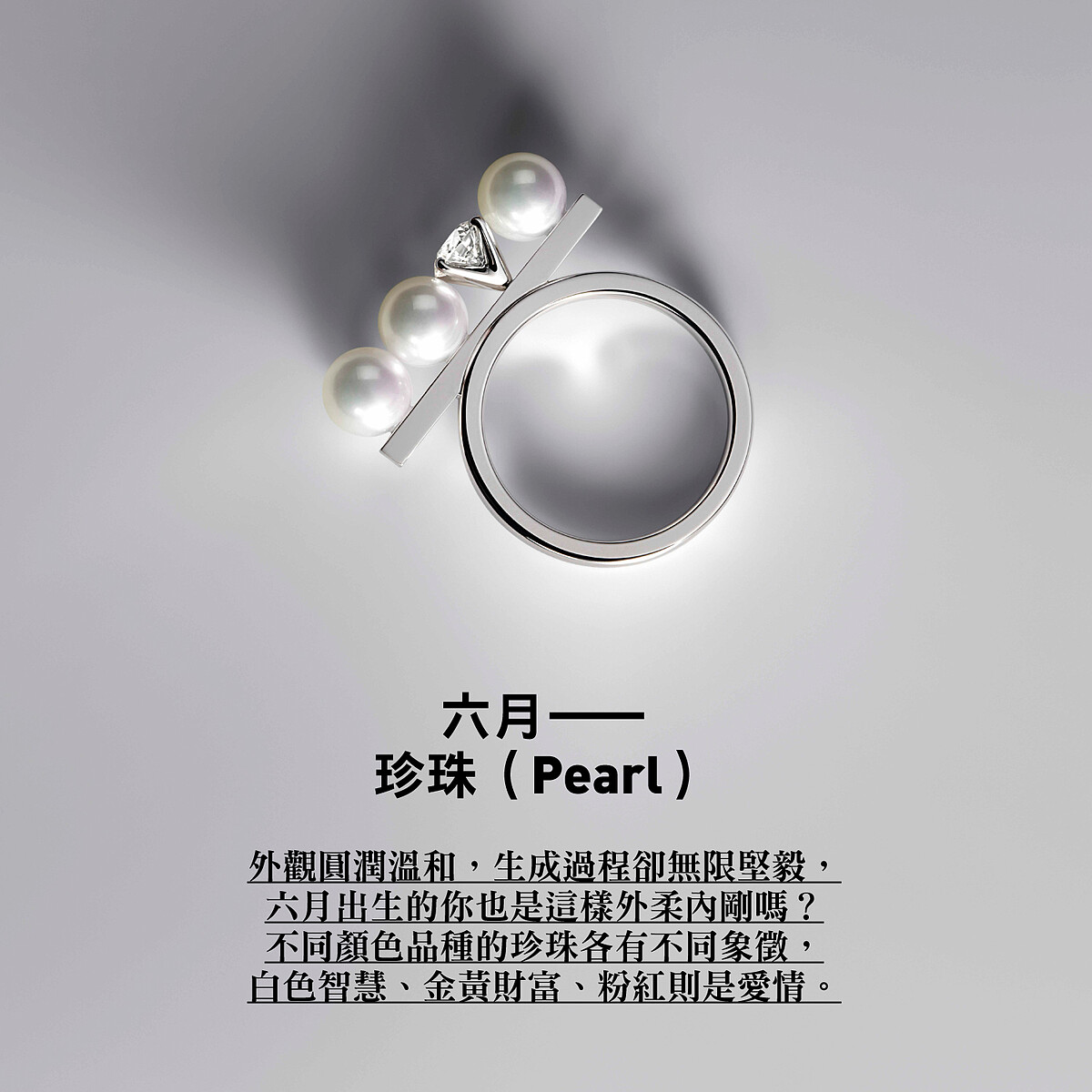 外觀給人圓潤溫和的幸福感受,不過從生成方式卻給人堅毅的想像,六月出生的你也是這樣外柔內剛嗎?而不同顏色(品種)的珍珠也各有不同的美妙象徵,像是白色帶來智慧、金黃帶來財富、淡粉紅色象徵愛情。