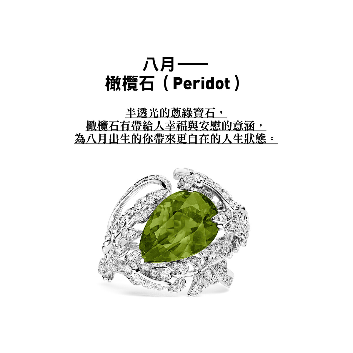 半透光的蔥綠寶石,橄欖石有帶給人幸福與安慰的意涵,為八月出生的你帶來更自在的人生狀態。