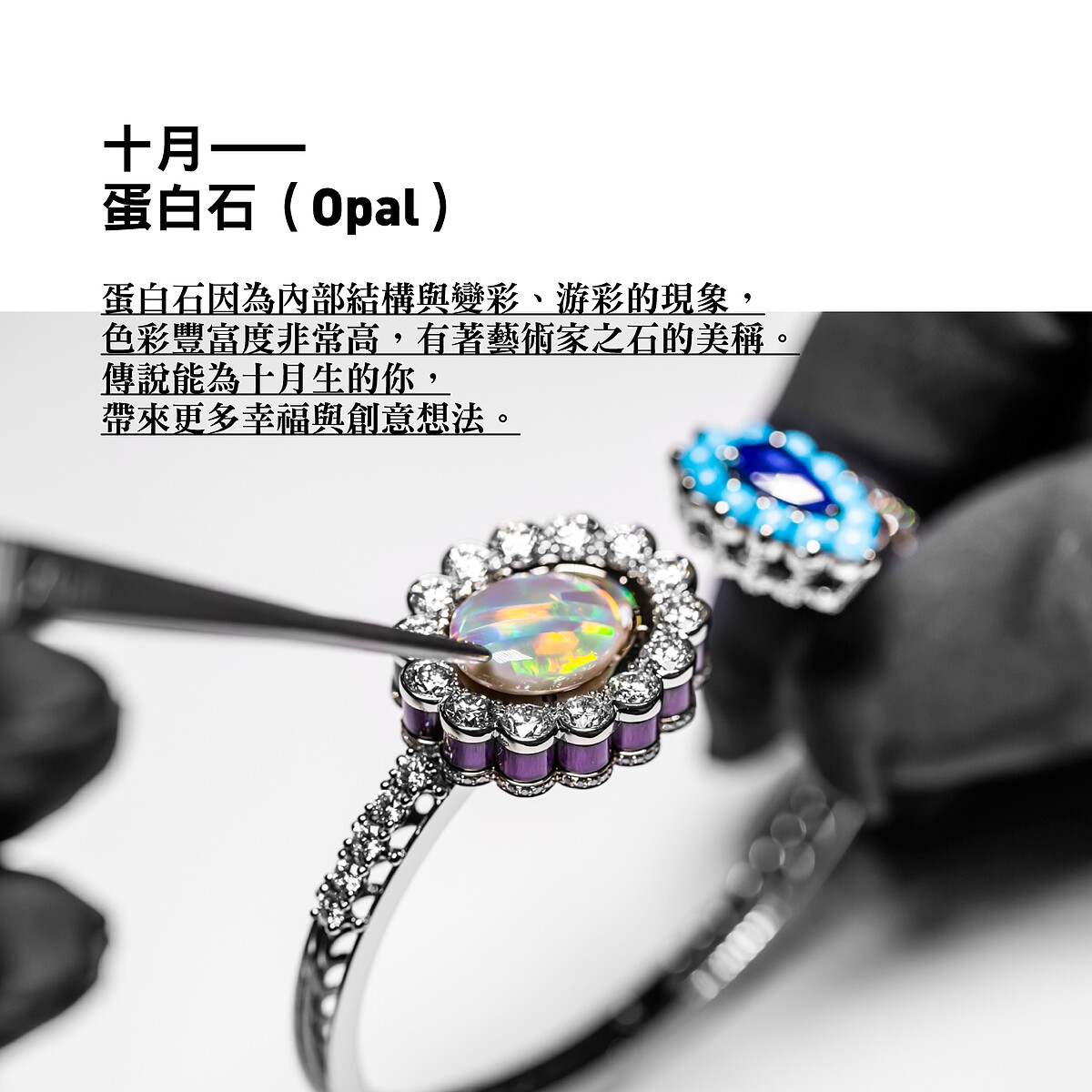 蛋白石因為內部結構與變彩、游彩的現象,色彩豐富度非常高,有著藝術家之石的美稱。傳說能為十月生的你,帶來更多幸福與創意想法。