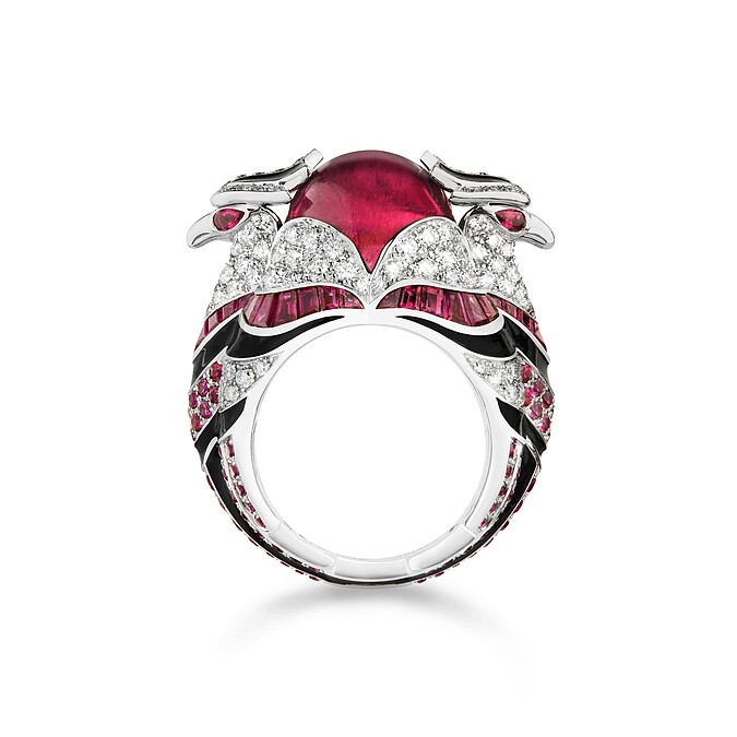 白金750材質、粉紅和黑色漆飾鑲嵌鑽石、綠色沙弗萊石、綠瑪瑙和黑色藍寶石