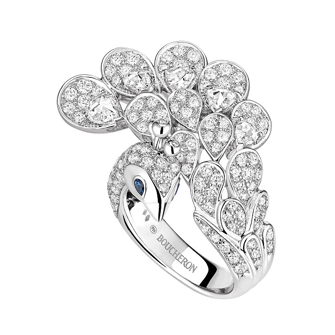 以藍寶石、鑽石或珍珠等不同寶石來演繹孔雀羽翼,不妨將兩只戒指一起疊戴於手指上,展現孔雀開屏的尾羽。