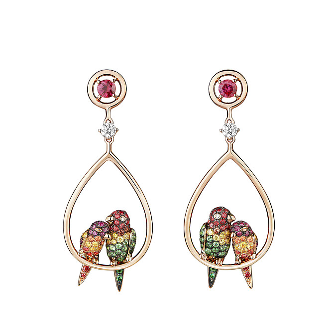 鸚鵡相互依偎的造型以雕鏤來製作,玫瑰金鑲嵌以橘色剛玉、莎弗萊石、粉色剛玉及黃色剛玉等彩色寶石,顯得活潑可愛。