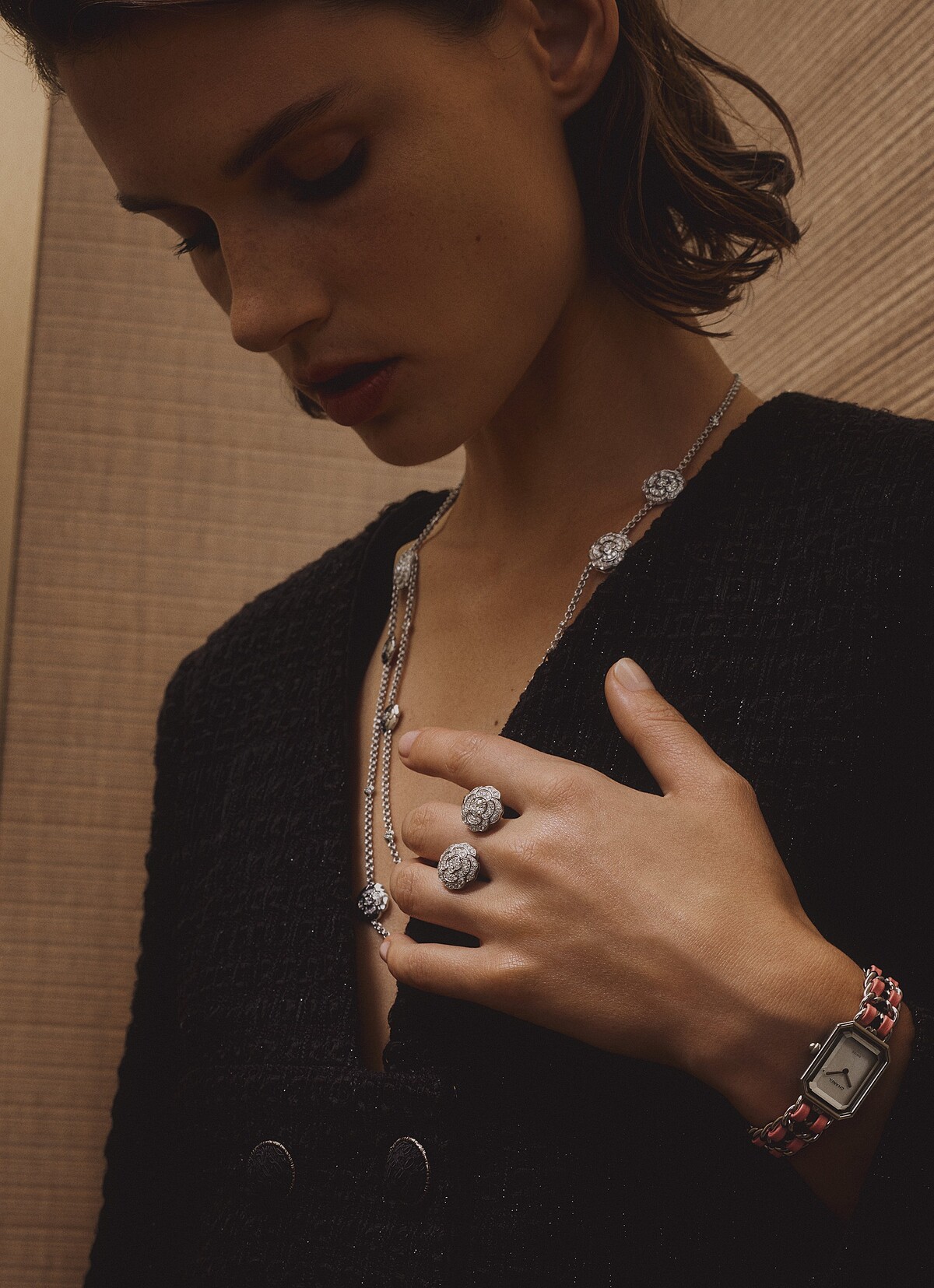 其中,趣味性的戒指可以輕鬆轉換成單指或指間戒搭配,以摩登現代手法讓山茶花玩轉於指間。而手鍊及長項鍊的可調節式鍊節設計,只要按壓花朵蕊芯,即能依個人喜好調整長度,妳可以將項鍊視為長項鍊直接佩戴,也可以纏繞成雙圈項鍊,或是學香奈兒女士將山茶花飾於腰際作為腰鍊大膽搭配,甚至,恣意地隨性纏繞於腕間作為手鍊,想法靈活大膽、無拘無束,百變造型間僅有那份優雅永存。