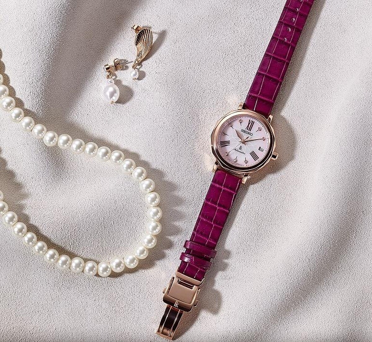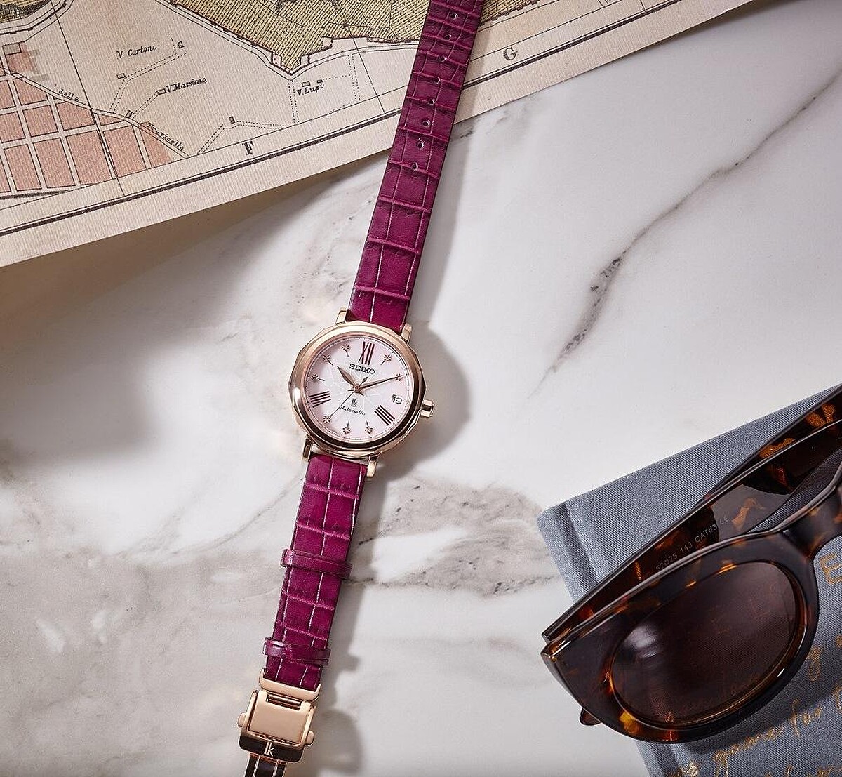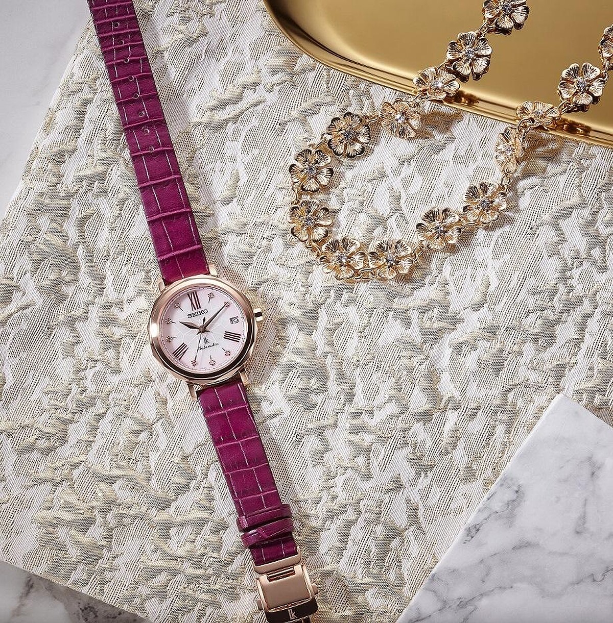 繪製著花朵盛開圖紋的錶面、 時標上鑲嵌八顆鑽石、珍珠母貝面盤作為基底的獨特設計,呈現出高雅清麗的低調奢華感,是不同於日本傳統配色,散發出多變豐潤光澤,使得柔美又帶有凜然感的「櫻色」,得以精湛詮釋屬於日本美學的魅力;錶殼與錶盤邊緣相接的部分是採用特殊切削加工,藉由菱角反射光線,配戴起來的亮眼度與舒適度都很令人驚喜;加上錶帶搭配了深於錶盤配色的深系櫻紫鱷魚皮錶帶讓高級感油然而生,多重樣貌就如同銀座這個城市有著多變魅力與萬種風情般的迷人。