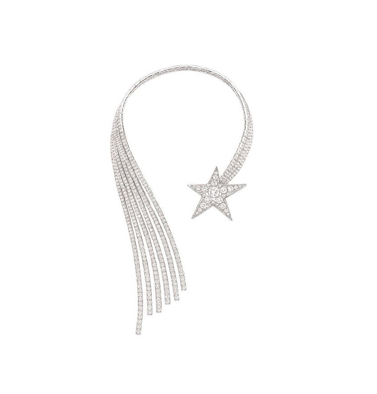 而設計也全然以女性觀點為主軸方向,能徹底自由駕馭才是最高核心宗旨。於是,香奈兒女士以白金座台鑲嵌了高達六百顆鑽石,打造出一款無扣頭六尾彗星項鍊,這種前開式無扣頭頸鍊,利用多段關節連接而成的設計,為傳統珠寶工藝開啟了全新視野。除此之外,採用了採用近乎無爪密釘的精緻鑲工來打造各式作品,不但讓每顆鑽石彼此有了空間,使得火光不被鑲座遮掩,更為各個銜接處爭取到了靈活律動,於是寶石們便能完全緊密符合身體曲線,不只奢華高雅,穿戴起來更是格外舒適。