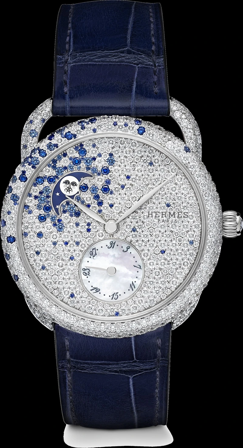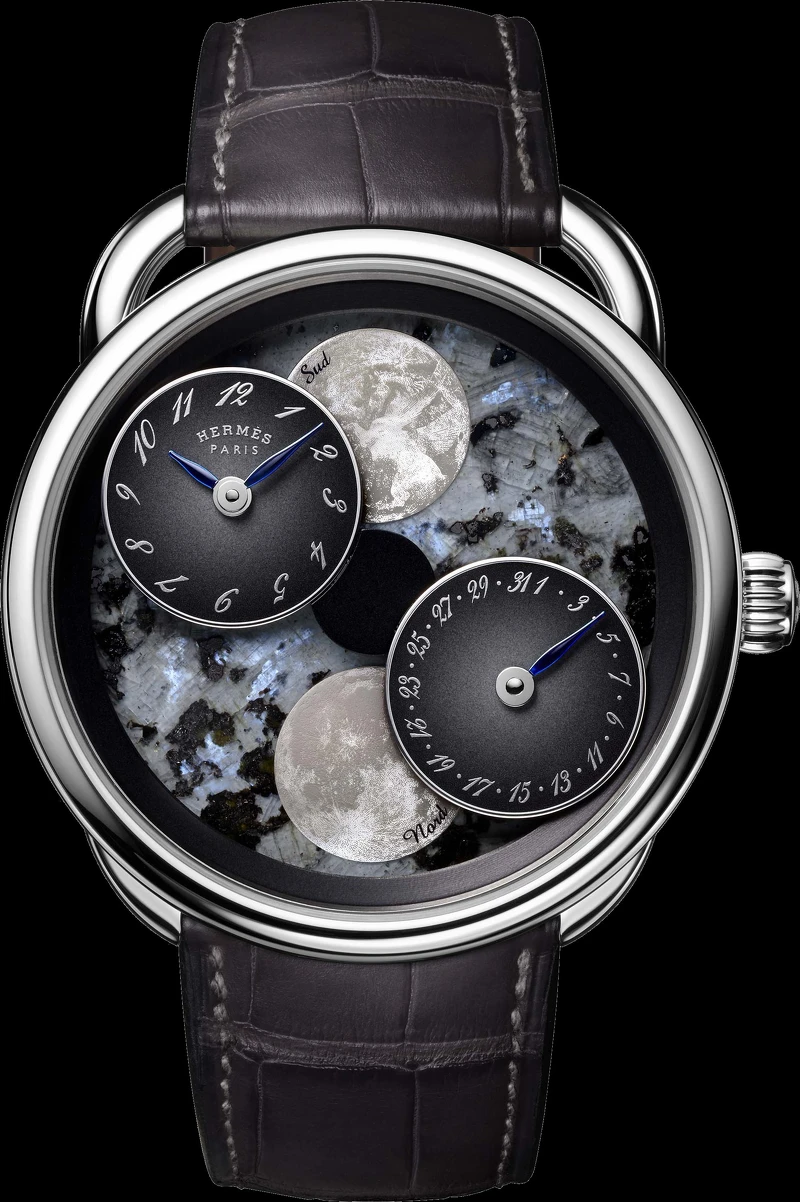 全世界目前大約有10多位隕石獵人,專職在世界各地尋找存在10億年以上的隕石,它們可能來自月球或其他星球,成分與來歷由科學家驗明正身,並附上證書,其稀少程度媲美貴重寶石!愛馬仕Hermès透過獵人蒐羅而來的隕石,運用於Arceau L’heure de la lune 月讀時光腕錶面盤上,手錶以專利機芯另類地詮釋月相:雙月盤隱身於時間與日期指示盤後,被象徵夜空的隕石錶盤襯托而出營造出無重力飄浮的想像氛圍。