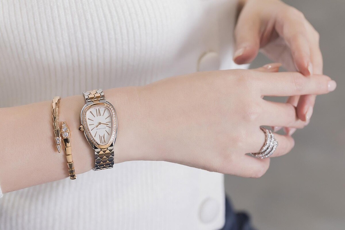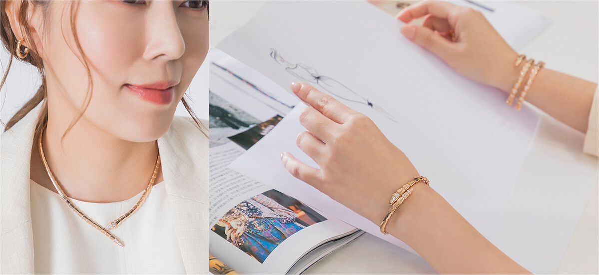 尤其這Serpenti系列的俐落華麗風格,簡約卻蘊含無限魅力,無論是項鍊、耳環戒指或腕錶,都可以與各種風格的服裝搭配,「它可以跟平常休閒或上班工作的衣服搭配,我覺得不需要特定場合,隨時都可以配戴這樣的珠寶,不用拘泥是否要出席場合才能配戴,女人就要隨性一點,不要覺得今天這樣是不是會太華麗,順應自己的心情最重要。」
