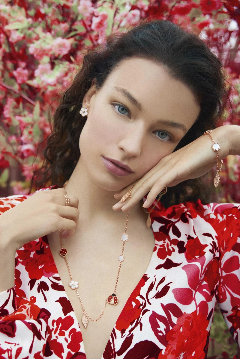 象徵幸運的動物一直在世家創意設計中有著極為重要的存在性,從第一款1930年問世的瓢蟲墜飾開始,便以其獨特閃亮吸睛的造型,在世家的手鍊及胸針上留下翩翩飛舞的身影,這次更在Lucky Spring系中與梅花、鈴蘭綠葉及花蕾,佐以玫瑰金、珍珠母貝、紅玉髓及縞瑪瑙的珍貴素材,再透過工匠以精湛技藝與反覆臨摹每枚圖騰的形態,刻畫瓢蟲在花葉間歡欣飛舞的意象,打造出優雅純粹卻又靈動活潑可愛的自然生態,譜成一曲歡欣愉悅的讚頌春日協奏曲。