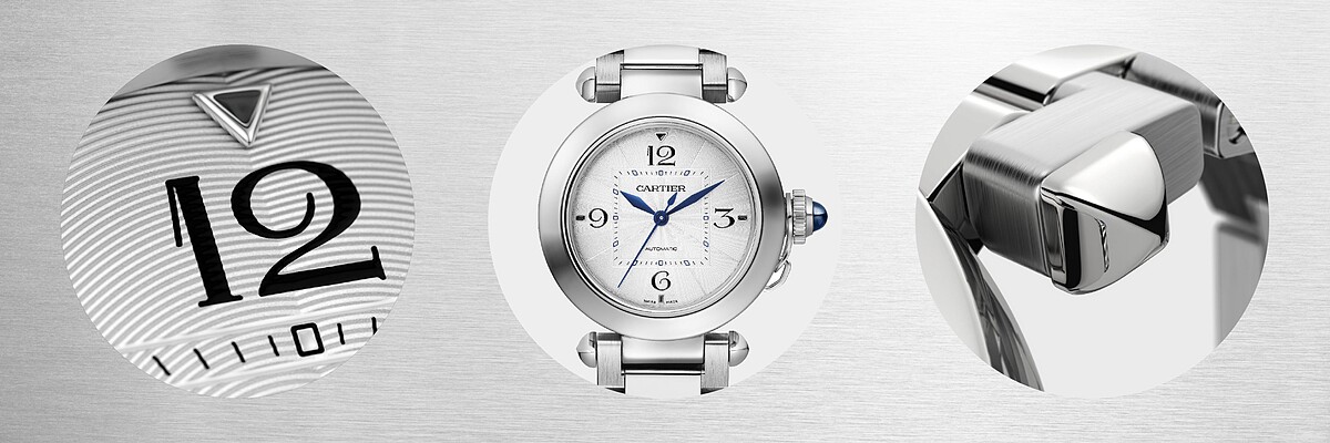 在Pasha de Cartier誕生的年代,「圓形」可說是當時錶壇最蔚為主流的設計,而卡地亞向來熱衷打破傳統框架,於是賦予了錶面方形分鐘軌道,又以四枚超大尺寸的阿拉伯數字來表現 3、6、9、12 四個時標,無疑借助了視覺上的放射性效果,因而強化了「圓中帶方」的對立衝突感,而「巴黎飾釘」更賦予錶帶獨有風貌,鍊形錶冠也將防水效果提升至最高值。