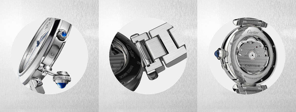 2020全新Pasha de Cartier將設計與實用性同時升級。首先,卡地亞於凹槽式錶冠下的上鍊器鑲嵌藍寶石或藍色尖晶石,如此雙重藍色寶石讓上鏈結構更為精進。錶帶部分也因自家研發的QuickSwitch系統讓更換過程極其簡易,只需輕按錶殼下方便能輕鬆替換精鋼、K金、皮革材質的各式錶帶,全新Pasha de Cartier也提供了個多顏色與材質讓佩戴者能適宜於各種場合。除此之外,SmartLink系統則為另一亮點設計,每個SmartLink鍊節皆只要透過按鈕,便可鬆開固定夾增添或取下金屬鍊節,佩戴者無需工具即可自行調校錶帶長度。
