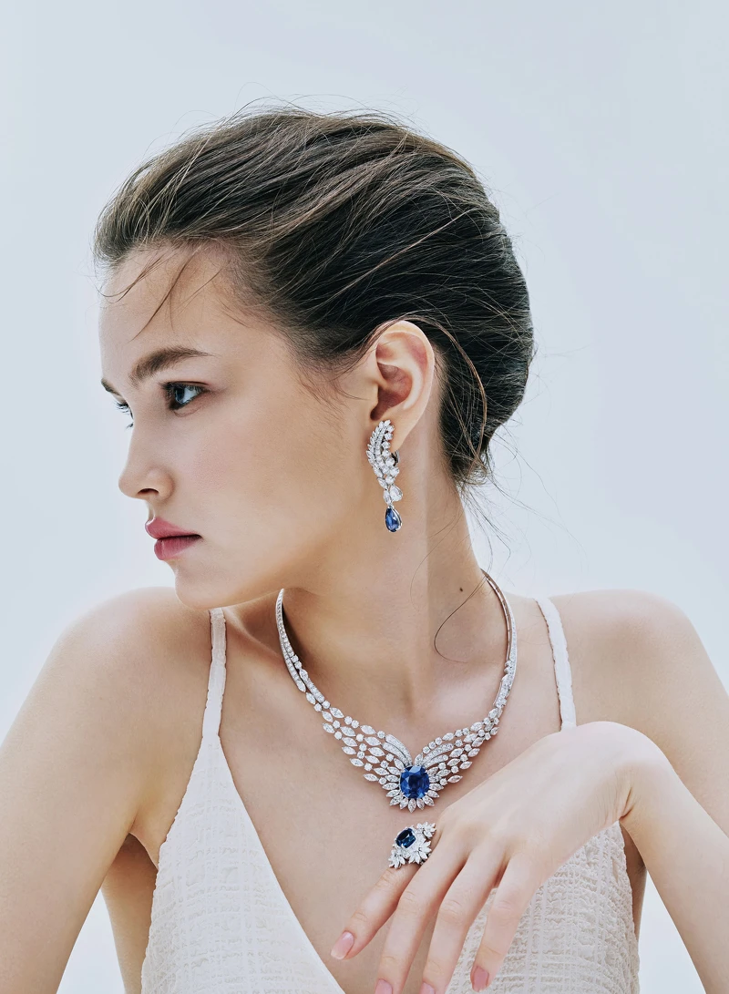 繼夢幻啟程之後,第二站來到了「Magnificent Haven 璀璨天堂」,所見景色則是隱藏於高山低谷身後的湛藍湖畔與濃郁樹林。此區以祖母綠與藍寶石領軍,帶我們遊歷各個世界之最夢境。正如「Wings of Light 系列斯里蘭卡藍寶石鑽石」項鍊與耳環,便是被稱為 「Cenote」(西班牙語中的 「聖井」)天然池塘的寫實印照,完全展現了此清澈湖泊的透藍與幽靜姿態。而斯里蘭卡除了是世界品質最為頂級的藍寶石出產地,在僧伽羅語中更有「燦爛之島」美稱,其矢車菊藍所獨有的天鵝絨質地,猶能詮釋似海若湖的層次色澤。