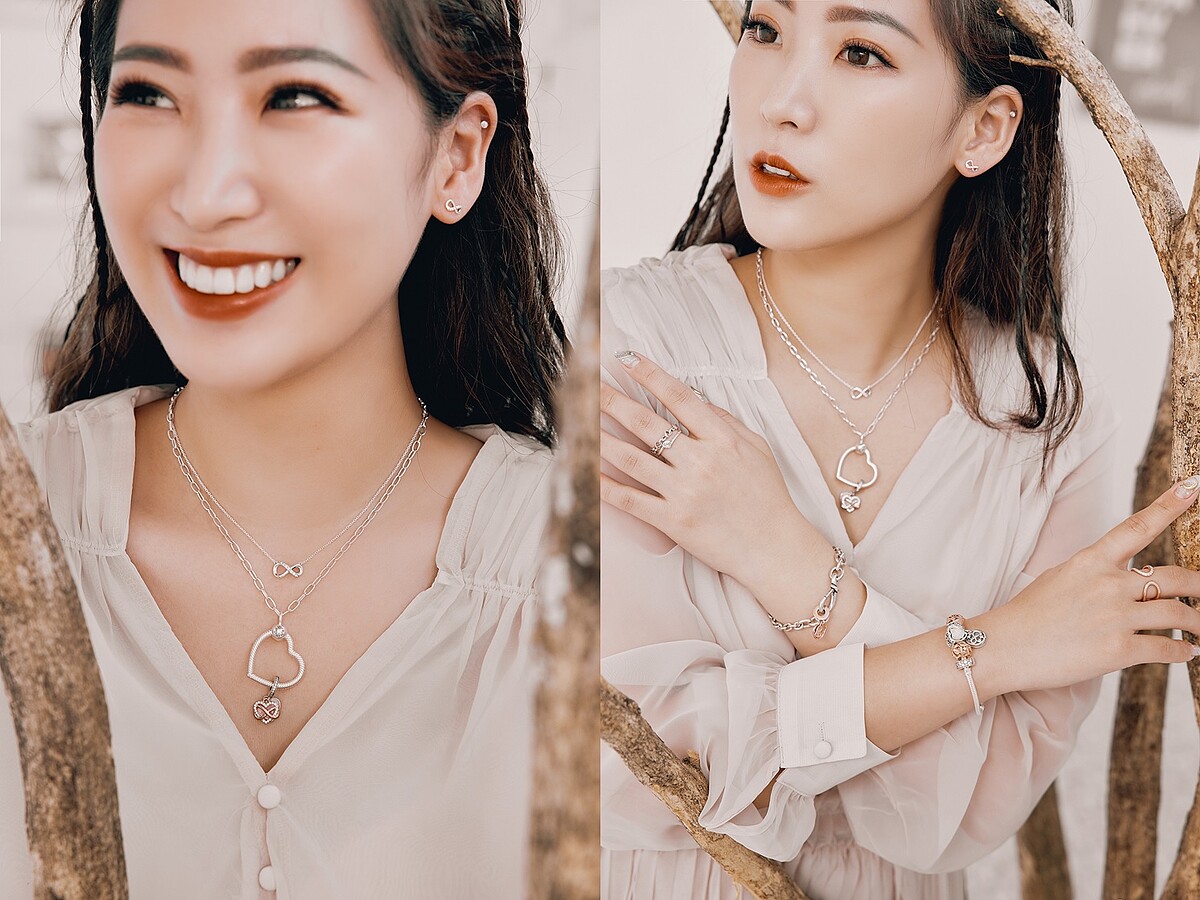 時尚部落客葛芮絲Grace選擇將無限符號項鏈與全新心型項鏈環堆疊出層次感,呼應手腕上自由搭配的串飾手環,與耳際、手指間簡約線條的耳環與戒指,在柔和浪漫的洋裝造型襯托下,營造出一種平衡在輕奢華與優雅間的好感魅力。