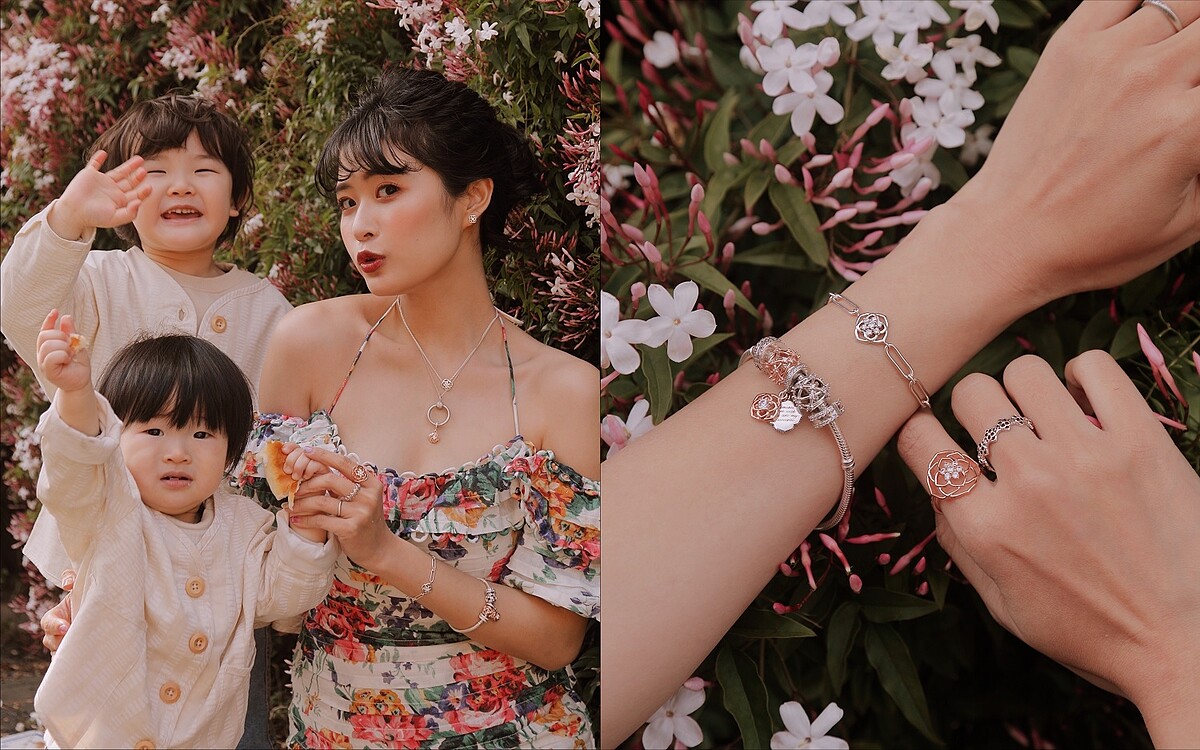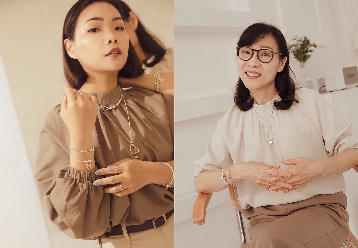 時尚潮模妍安及Yoyo都很有默契的攜媽媽亮相大玩混搭造型,利用全新心形項鏈環搭配母親節系列吊飾營造好女孩系的甜美,兩人在首飾搭配上也展現出絕佳時尚默契,以項鏈、手環、戒指相呼應,向彼此互訴愛意。