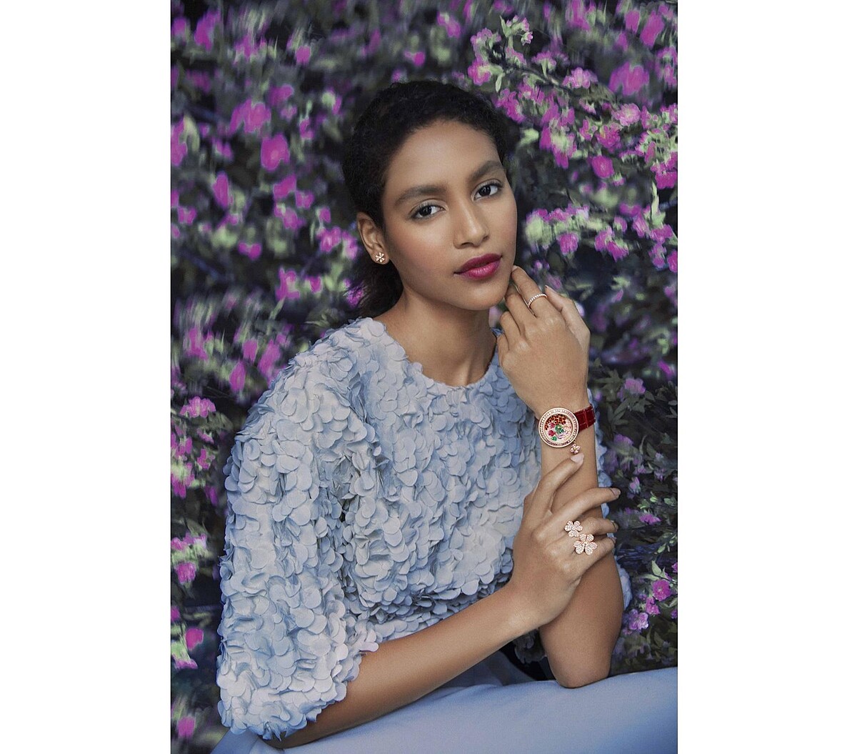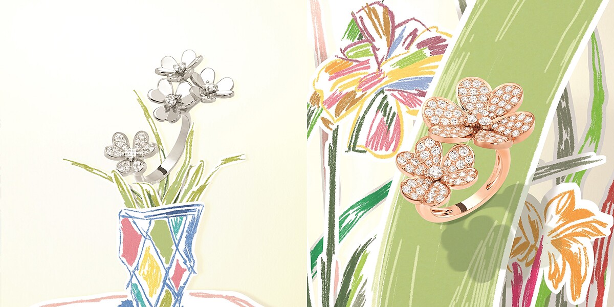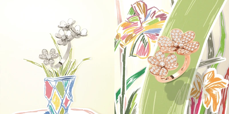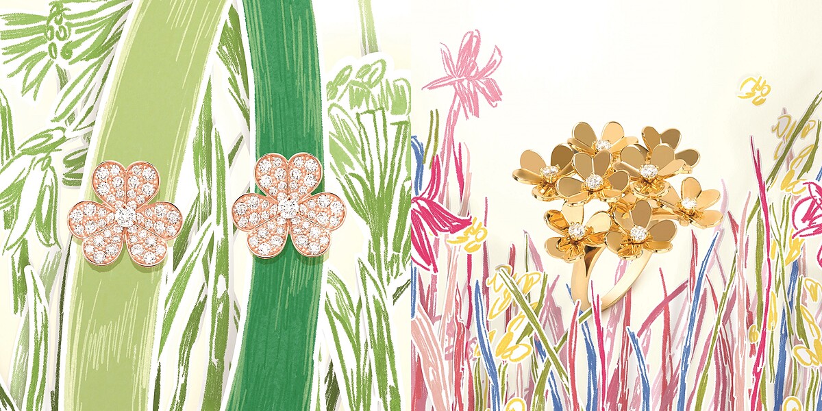 粉彩線條與色塊作為春日背景,讓微微顫動的葉子呼應春風輕拂盛放的花朵,為Frivole系列珠寶注入生生不息的奇妙魔法。