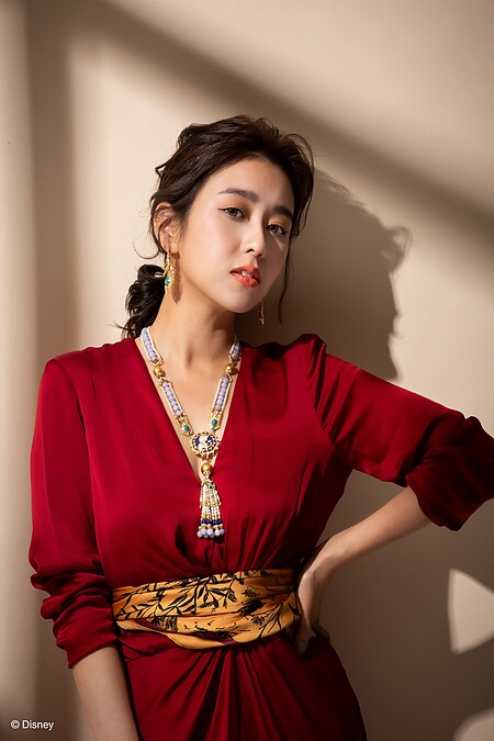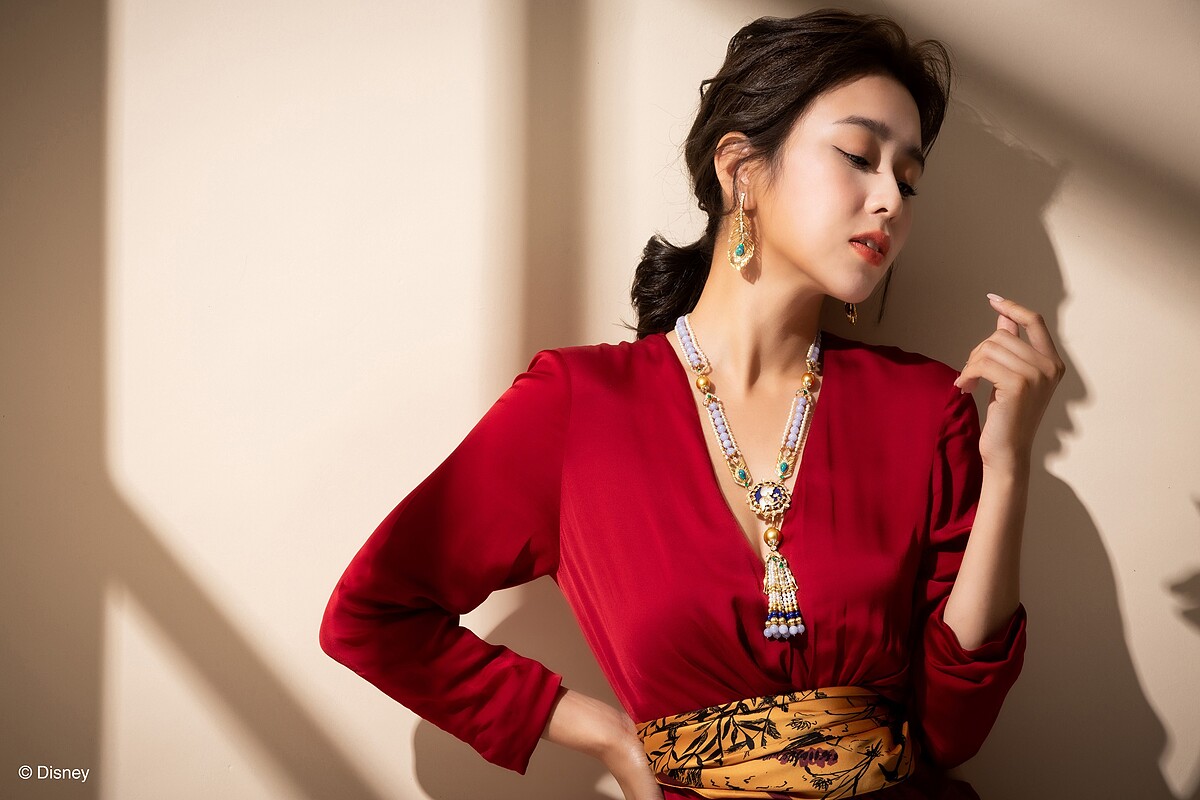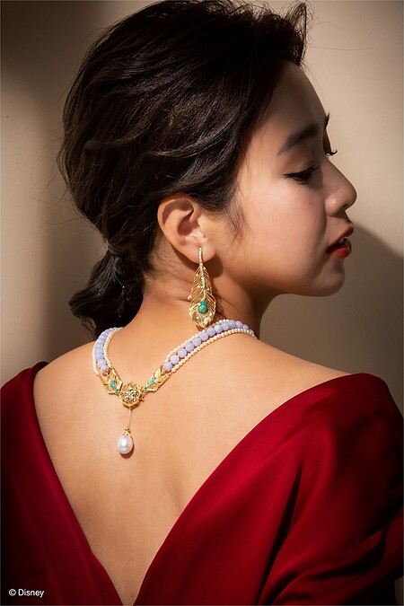 孔雀羽毛造型耳環以茉莉公主穿的禮服為意象,鑲嵌各種色調的礫背蛋白石綻放出神祕色彩。項鍊則以白蝶貝打造茉莉公主的優雅側臉剪影輪廓,精緻裝飾璀璨配鑽,更將鑽石原石隱於流蘇設計中,象徵內心宛如鑽石原石之人才能進入魔法神燈沉睡的魔法洞窟含意。