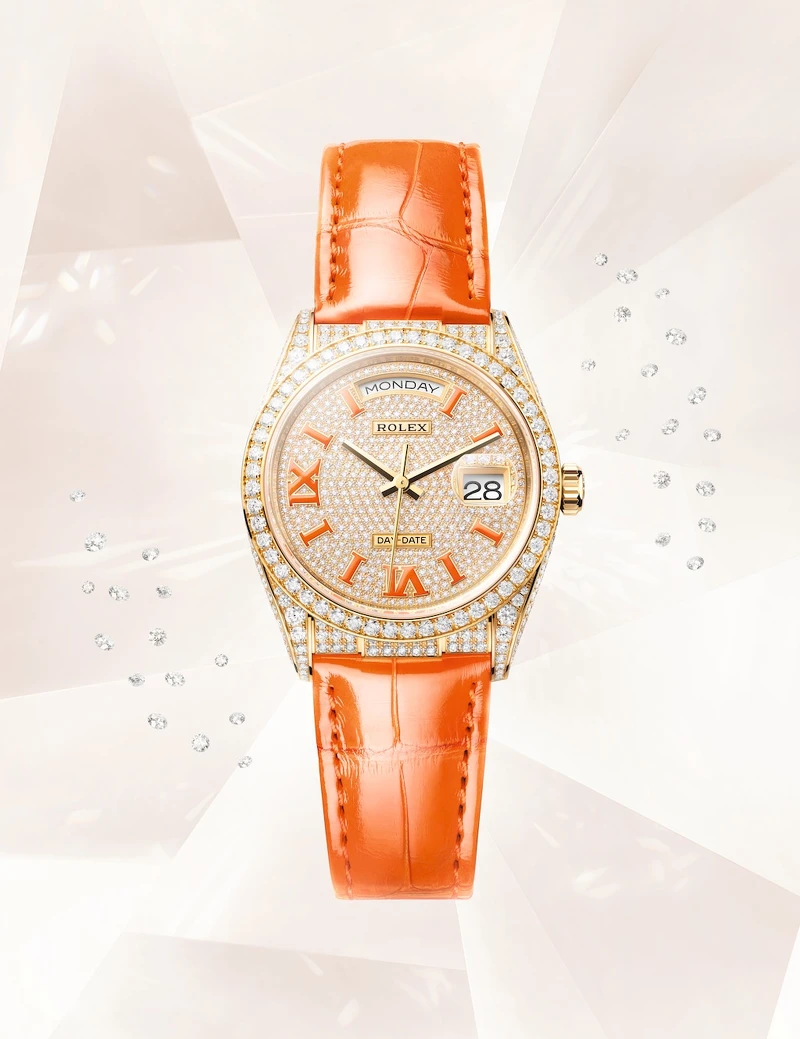 勞力士新推出三款鑲嵌寶石款Oyster Perpetual Day-Date 36(蠔式恒動星期日曆型36),有著五彩亮麗,流光溢彩的吸睛樣貌,新款蠔式錶殼的錶耳、錶殼兩側與錶冠護肩共鑲嵌254顆圓形鑽石;外圈則鑲嵌52顆圓形鑽石,加上錶面密鑲450顆鑽石,搭配琺琅鐘點標記與羅馬數字VI及IX,並配備精緻的鱷魚皮錶帶,散發出璀璨奪目、熠熠生輝的光芒。
