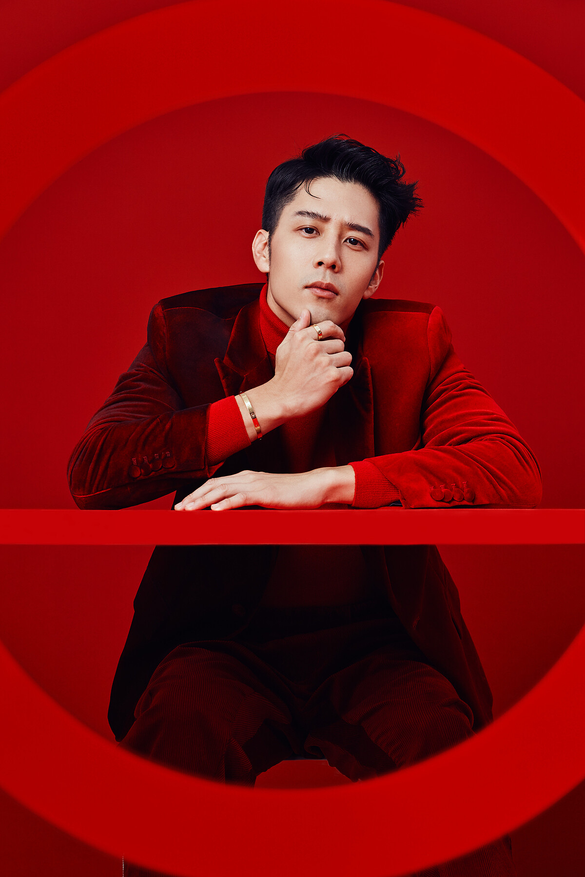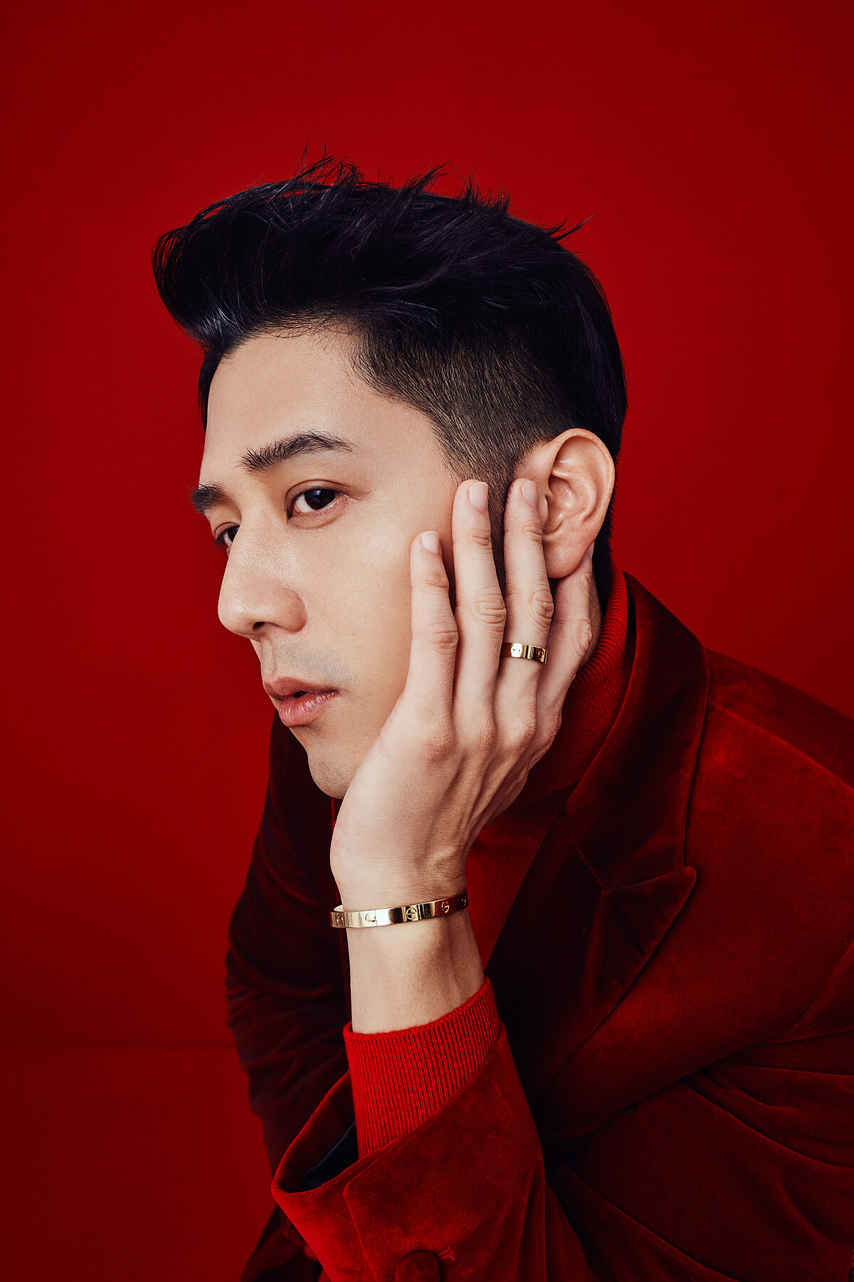 自出道以來便以出色的時尚品味備受注目的胡宇威,打扮向來低調、優雅,這回大膽突破自我風格,換上一身天鵝絨紅色正裝搭配黃K金 LOVE 手環,更加彰顯他獨有的貴族氣息,醒目的紅與醒目的金相輝映,散發出的熱情與自信格外迷人,然而俏皮把玩 LOVE 手環時又像個純真的孩子,試圖找出關於愛的正確解答的模樣,顯得相當可愛又溫暖。