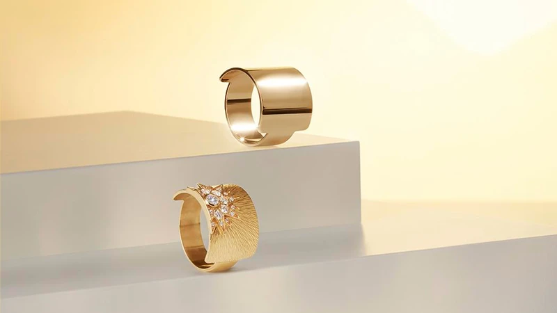 為頌揚拂曉晨曦的樣貌,伯爵以兩款18K玫瑰金戒指分別呈現優雅與日出東方的意象,其中一款飾有經典的「宮廷式雕刻紋飾」(Palace Décor)及19顆圓形明亮式切割美鑽,以地平線上初現晨曦,宣告新的一天的開始。接著迎來旭日初升的魔幻時刻,將藍寶石與鑽石以雪花鑲嵌技法鋪鑲呈現,微微的藍光與鑽石光耀相互映襯,以晨露薄霧意象浪漫開啟美好一日。日正當中的陽光明亮熾熱,伯爵以活潑的鑲嵌手法,讓美鑽和黃色藍寶石交錯排列,展現燦陽當空時的熱情萬丈。