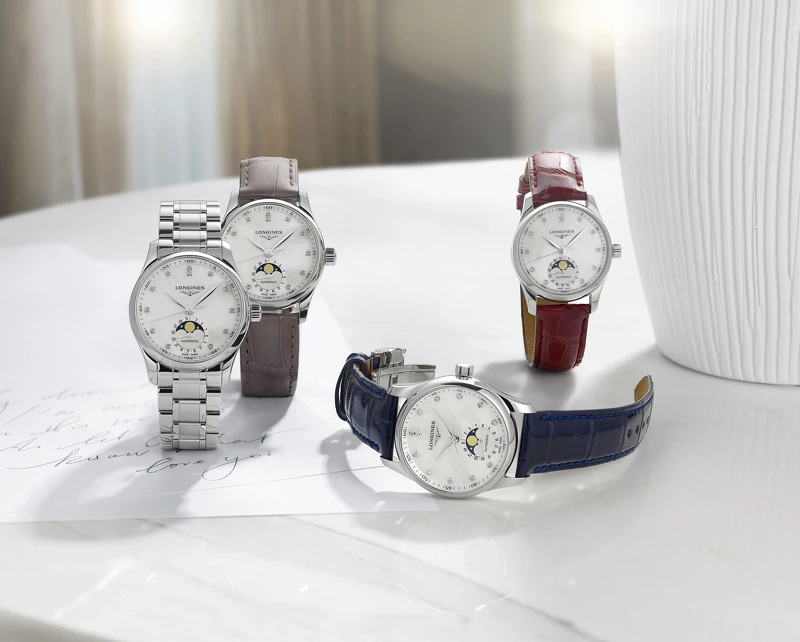 為了滿足現代都會女性日常配戴腕錶所需的優雅美觀、精緻高尚以及搭配造型的多種需求,Longines浪琴表這次的Master巨擘系列月相女士腕錶在女性關注的時尚美觀表現上,更是推出了紅色、藍色、褐灰色皮革錶帶與不銹鋼錶帶的多種選擇,在搭配上珍珠母貝、銀色麥穗紋、藍色太陽紋不同面盤材質的組合,變化出各具特色風範的不同面貌,完全滿足擁有不同特質魅力的女性,無論是職場正裝、日常休閒或隆重晚宴都能完美融入著裝造型中,百搭的時尚表現力使得一登場就深受時髦女性所青睞!