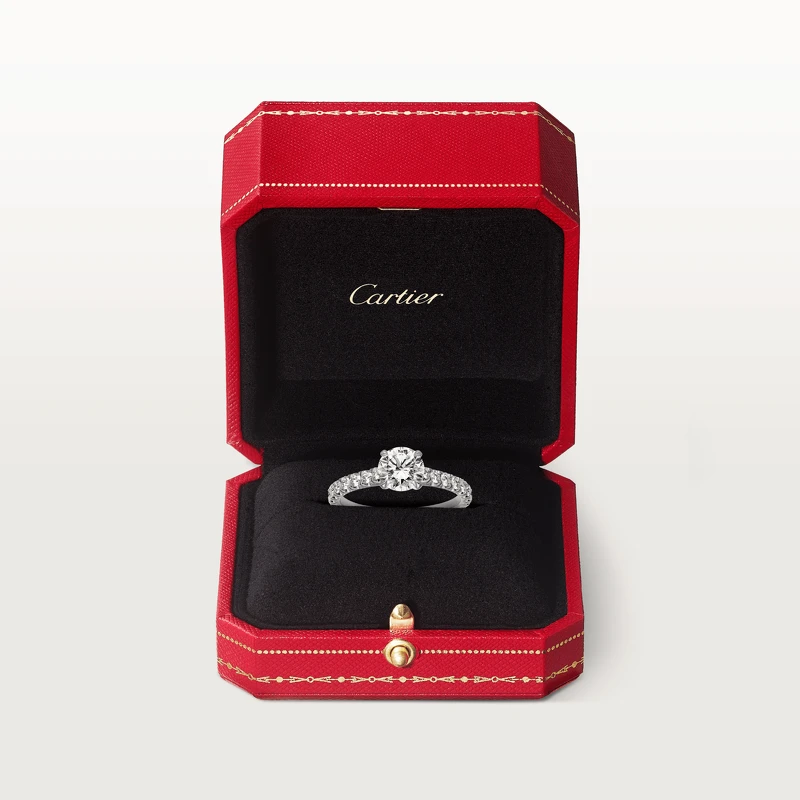 Solitaire 1895系列訂婚鑽戒無疑是卡地亞最經典的作品,以卡地亞獨特的四鑲爪工藝聞名,作品線條簡約俐落,戒指上盡可能縮減貴金屬用量,凸顯鑽石奪目光芒,特色在於僅以四枚鑲爪固定一顆璀璨鑽石,貴金屬部件內、外側以一根絲線進行鏡面拋光,以增強光線折射效果,細微的鑲爪也拋光修圓,以獲得最佳佩戴舒適感,作品除了完美展現頂級鑽石的絕美氣息,也象徵戀人們對於愛情的純粹追求,因此自1895年問世以來,便是品牌歷史上最經典的設計。