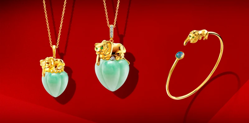 設計師以簡潔俐落線條呈現作品身體輪廓,精雕細琢Lucky 12系列中,全新金虎臥福設計,宛若立體雕塑的造型老虎,靜臥在當代幾何風格的蟠桃玉上,為喜慶熱鬧的年節,更添雋永的珠寶時尚趣味,在充滿華人色彩的農曆新年更顯時代意義。「臥虎、臥福御守」珠寶新作,延續金虎臥坐於天干地支生肖盤位上,以綠寶石點睛,踩踏著玉石蟠桃,承載庇佑與守護之意。設計師更取「虎」諧音「福」之義,希冀配戴者2022年「臥虎、臥福」,福至祥寧。