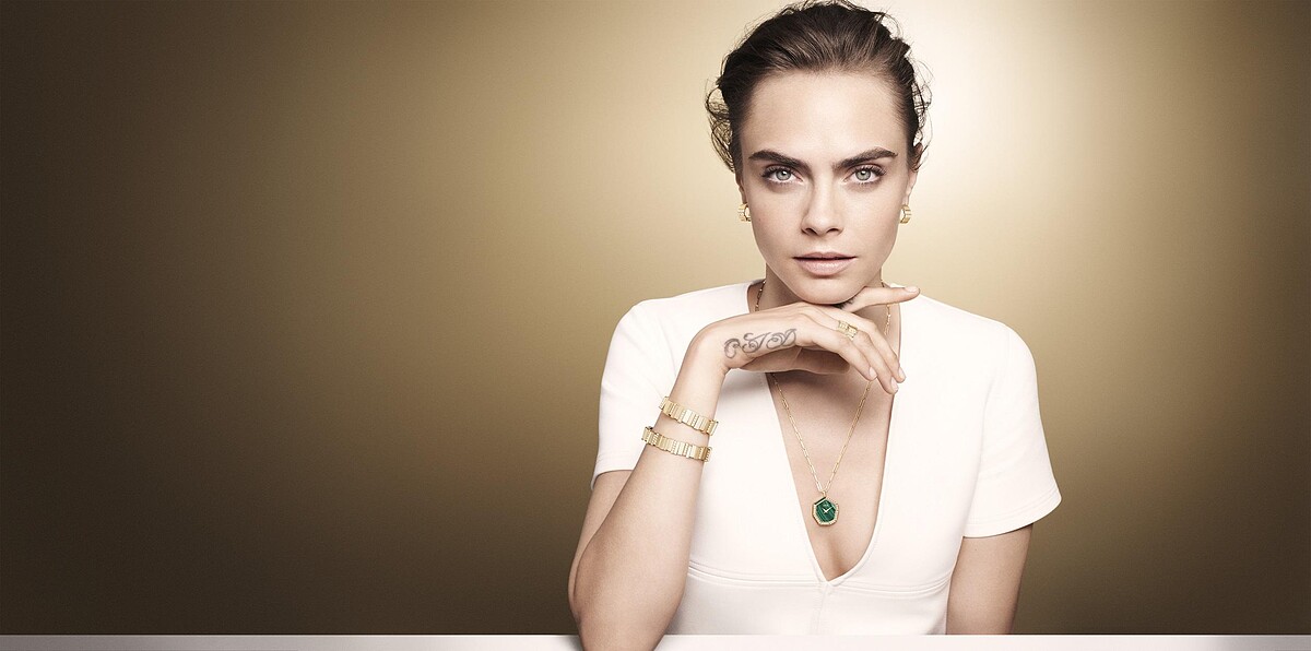 在單一色彩的領域裡,因黃金、玫瑰金及白金戒指、手鐲與耳環與鑽石的搭配變奏,使得珠寶系列愈加完整。精緻金工熟稔地嬉玩著多重意涵上的對比,凸顯了Gem Dior系列的創作異想,與希冀穿戴的觸碰之間。
