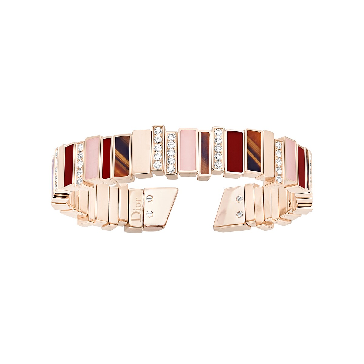 Gem Dior的非典型幾何線條,亦擴張為一系列魅力難擋的珠寶。系列中的黃金彩寶戒指及手鐲堪為明星款式,特意錯位卻完美接壤的彩寶及鑽石鍊節,幅射出紅色與粉色輪替的色彩波幅。