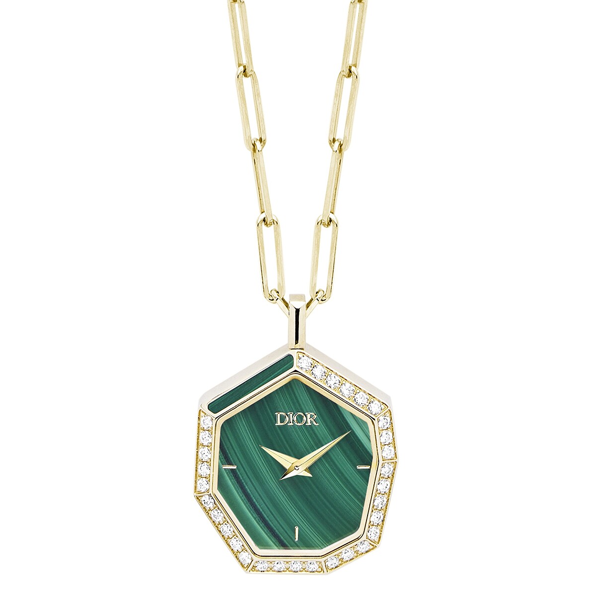 自然與時裝的精準調拌,催生了Gem Dior系列,分秒間一新耳目的設計,使之成為一重創意與非凡並駕齊驅的宣示。系列中最具代表性的黃金彩寶腕錶即為最強而有力的例證,搭載著孔雀石錶盤的八邊型懷錶,形成鍊墜型態的懷錶項鍊,為腕際帶來了有別過往的搭配奇趣。優雅、氣質,卻無容忽視。Gem Dior腕錶另備有鐲身設計,配戴時形如一只開口式手鐲,每款均附可置換的黑色皮革錶帶。