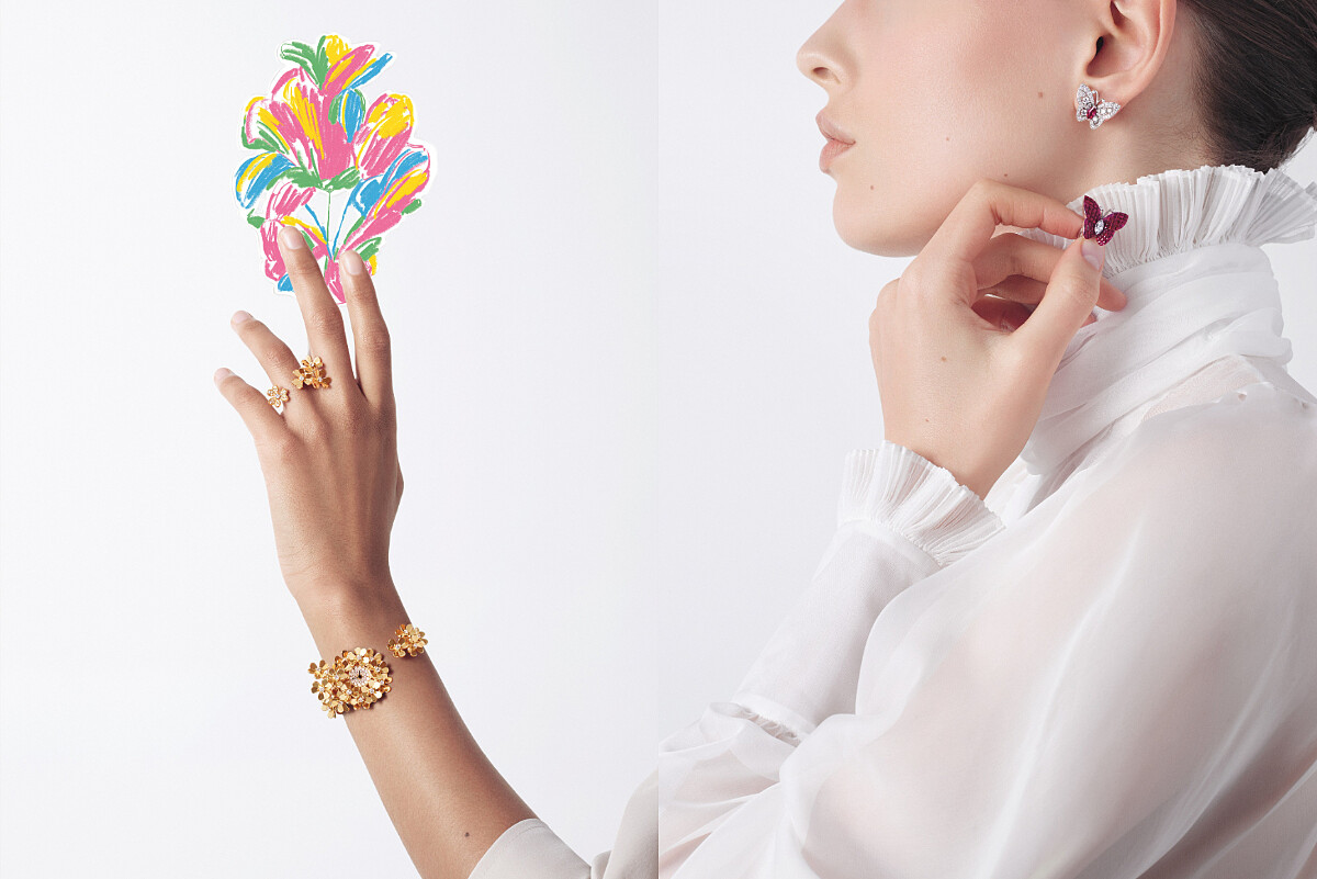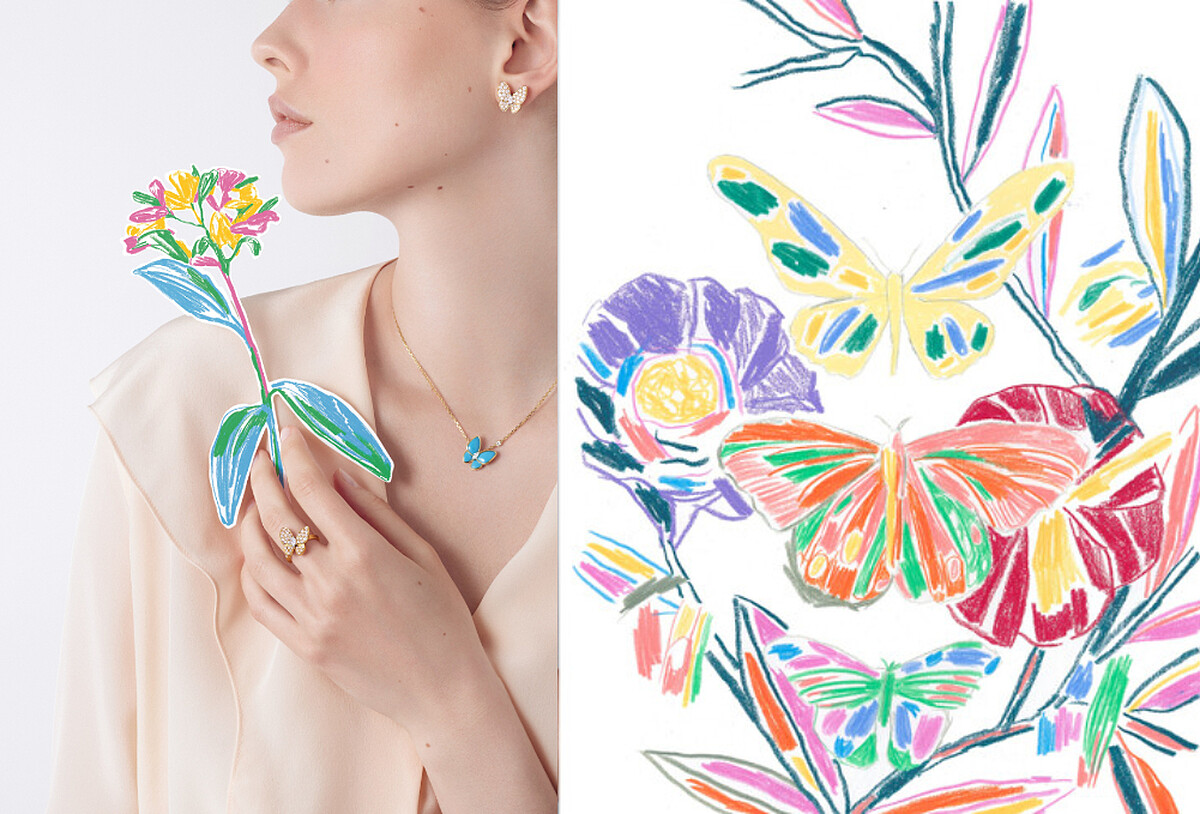 自1906年Van Cleef & Arpels梵克雅寶創作出首件蝴蝶作品,蝴蝶一直啟迪世家無窮想像,透過各種珍稀精選素材,完美詮釋蝶舞丰姿。為了呼應這春日浪漫情懷,陳列於店中的精緻絕美珠寶作品也以蝶舞翩飛的概念為主,無論是首次在蝴蝶上飾以鮮明綠松石、洋溢暖意的黃K金及璀璨美鑽的全新上市Two Butterfly系列,並以不對襯設計方式讓吊墜、Two Butterfly Between the Finger指間戒及耳環注入靈動活力,完美展現蝶舞花間的自然意象。