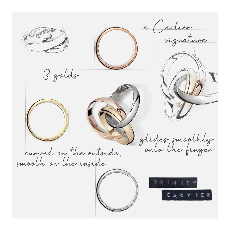 由路易‧卡地亞(Louis Cartier)於1924年打造的Trinity戒指,憑藉三枚以三色金屬與簡單環圈交織而成的Trinity戒指,呈現靈動流麗之美,並被賦予三色金屬分別代表愛情、友情、親情的真摯情感意義,成為跨時代的不朽經典之作。