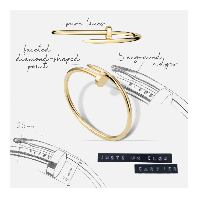 1970設計而成的Juste un Clou手環,見證了卡地亞將一枚簡單螺絲釘幻化為細緻珠寶的設計功力,同樣透過簡潔俐落及和諧比例讓其更顯精緻雋永,前衛獨特的外觀彰顯了大膽奔放的自由風尚態度。