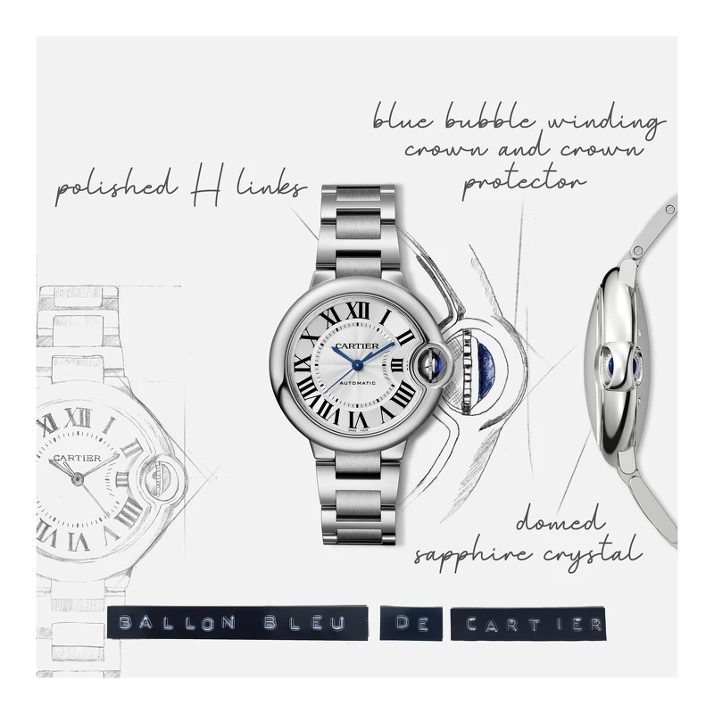 誕生於2007年的Ballon Bleu de Cartier腕錶,有著圓潤立體的造型外觀,雙凸面圓形設計,巧妙平衡作品線條和立體度,並讓藍寶石水晶凸面和上鍊錶冠與錶殼有著完美契合的平衡,加上藍色氣球和錶冠護蓋與設於3時位置的金屬圈相連,綻放無可挑剔的優雅氣質光彩。