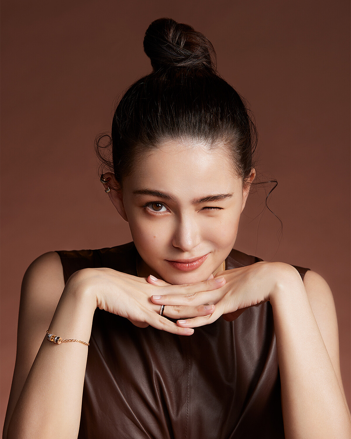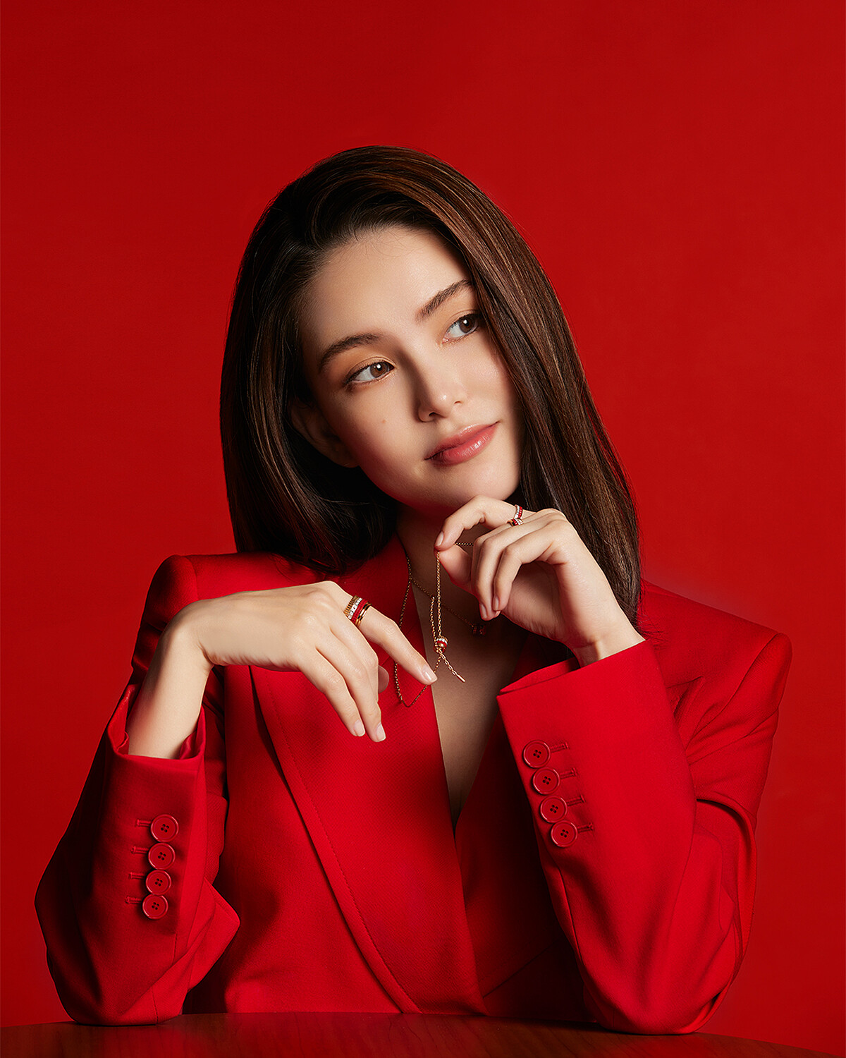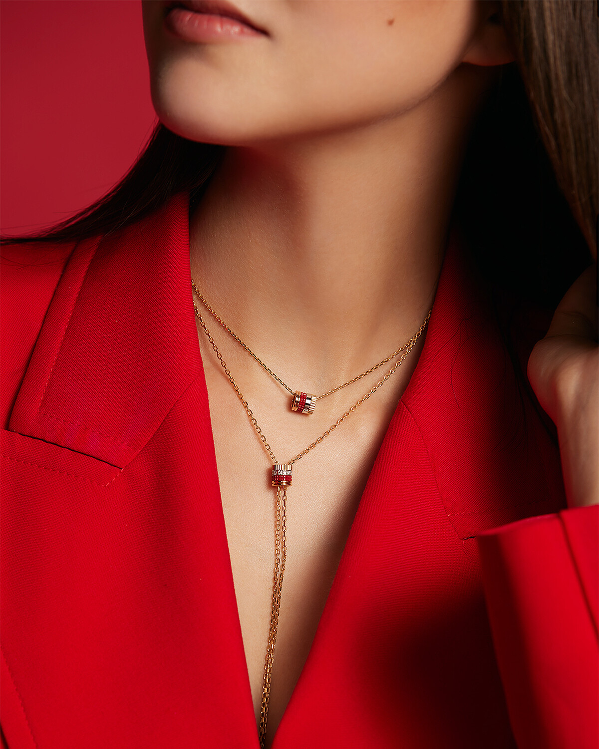 優雅中帶點古靈精怪氣息的昆凌時尚品味向來不俗,這回分別戴上Quatre Classique及Quatre Red系列珠寶搭配棕色皮革洋裝和紅色西裝外套洋裝,其中,最吸睛的莫過於一條以兩個Quatre Classique圖案做為設計重點的手鍊,具標誌性的圖案搭配精緻的黃金細鍊,簡約大方卻極富視覺份量,特別的是兩枚圖案可沿著鍊子靈活滑動、隨著造型變換位置,頗富玩味。而紅色造型則以Quatre Red系列珠寶做焦點,鑲嵌了鑽石及紅色高精密陶瓷的墜鍊、長項鍊、戒指與俐落霸氣的造型相呼應,高雅且熱情的姿態正適合春夏時節。