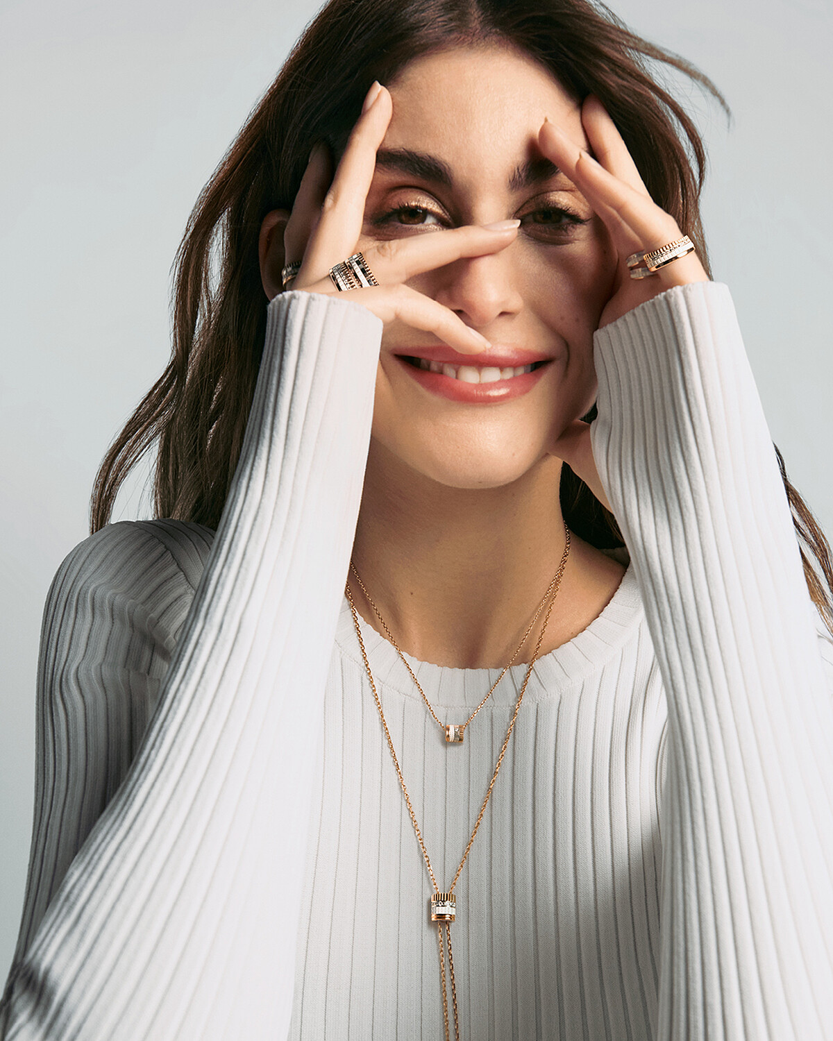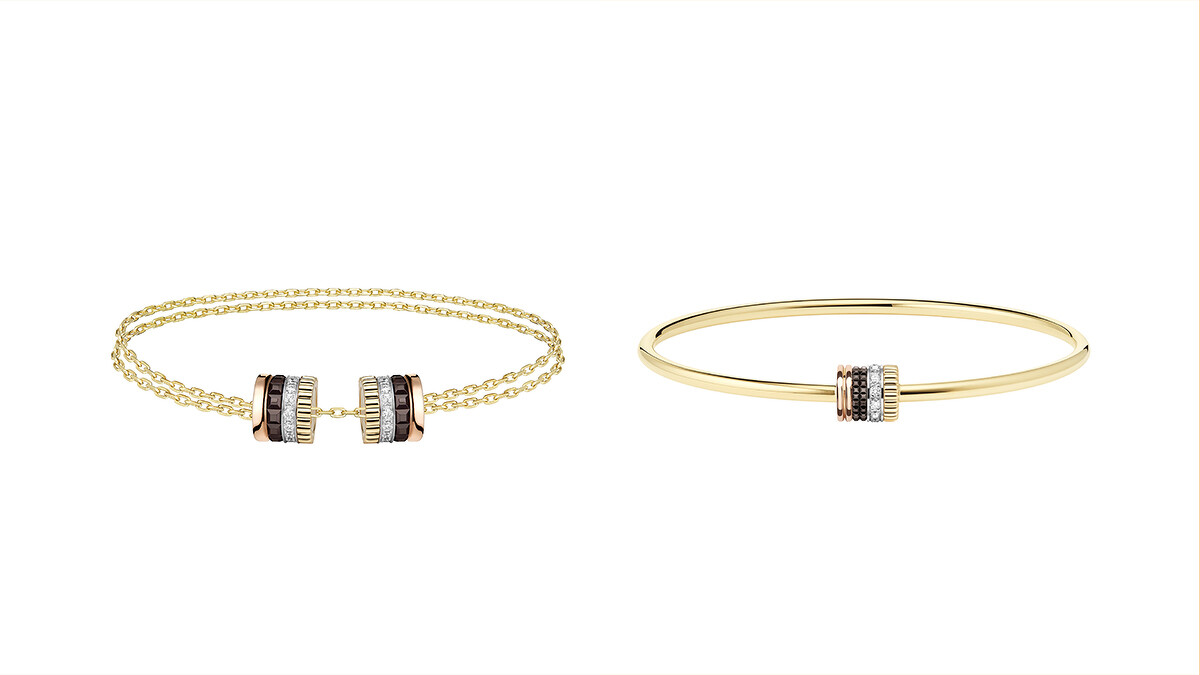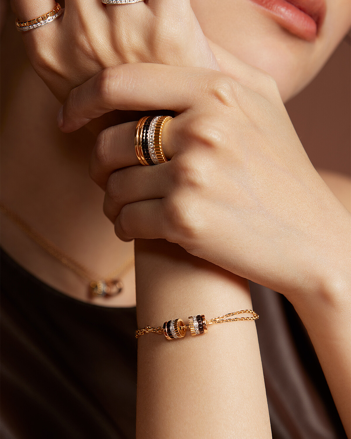 兩枚以黃金、玫瑰金和白金打造,鑲嵌圓形鑽石及裝飾棕色PVD的Quatre Classique圖案,沿着長長的項鍊靈巧滑動,可隨著造型單圈或雙圈配戴。