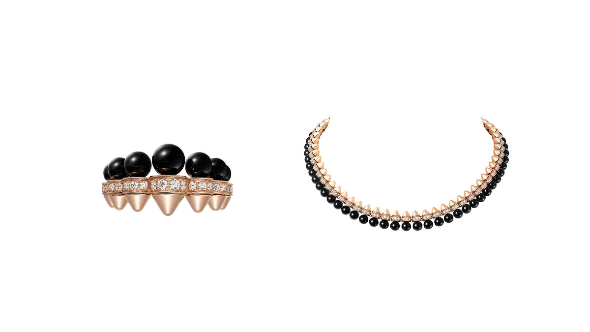 系列另一款全新作品則加大圓潤柔美的黑色縞瑪瑙圓珠及造型立體的玫瑰金飾釘,中間飾以單排鑲嵌鑽石,圓形搭配尖錐形的幾何設計激盪出充滿對比的雙重魅力,加上寶石與金屬達極致拋光後所映出的耀眼光澤,令作品更顯猶如高級訂製服的精緻質感,全新軟鍊式項鍊、手鍊、耳環及戒指可成套搭配,也可與系列作品相結合,而Clash de Cartier充滿個性的風格除了可為日常造型增添獨特魅力,亦可為優雅的正裝風格畫龍點睛,具有多變實用的搭配性,絕對是喜愛嘗試多變風格的時髦人士必須入手的珠寶單品。