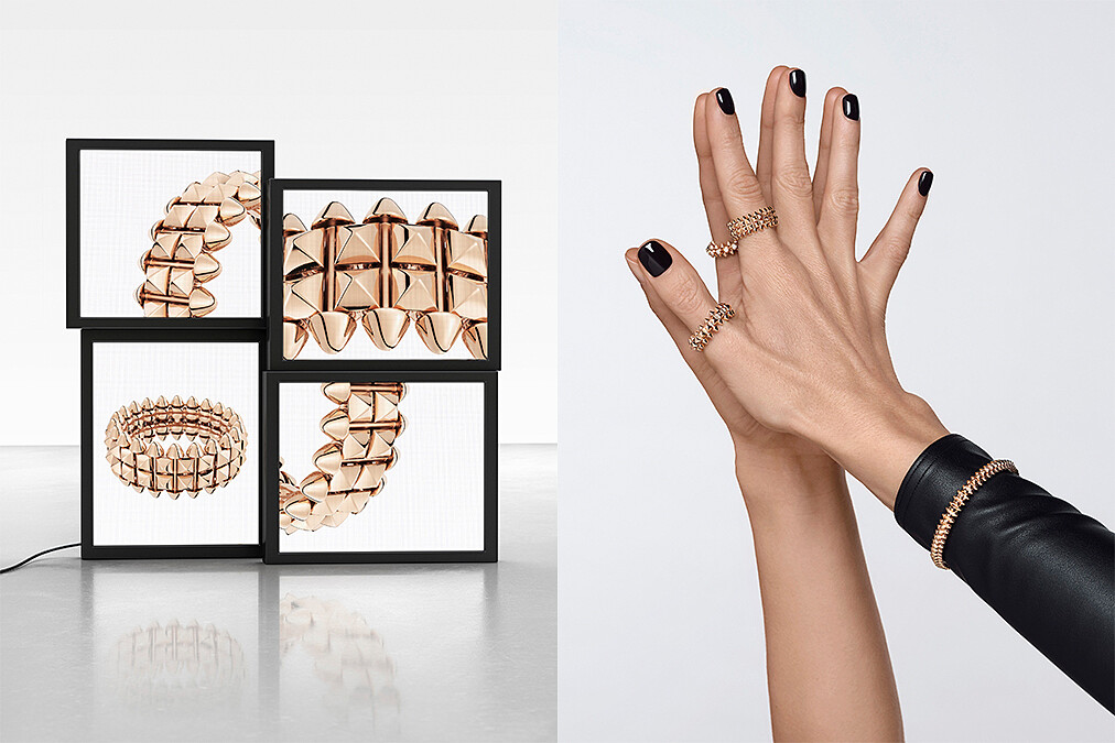 有別於Clash de Cartier系列傳統的單排設計,於今年六月份上市的全新戒指及耳環以數量加倍的雙排方形釘詮釋,中間以兩排方形巴黎飾釘(Clous de Paris)搭配圍繞於側邊的尖錐形飾釘,雙排的層次不僅加乘飾釘特色,視覺上更能打造宛若時下流行的疊戴風格,並在兩側的尖錐形飾釘上融入機械感巧思,令其可自由靈活擺動,更顯作品的與眾不同、活潑玩味;材質上則選用柔和的玫瑰金色澤低調優雅,中和輪廓鮮明的放大飾釘,營造平衡對比的美感。