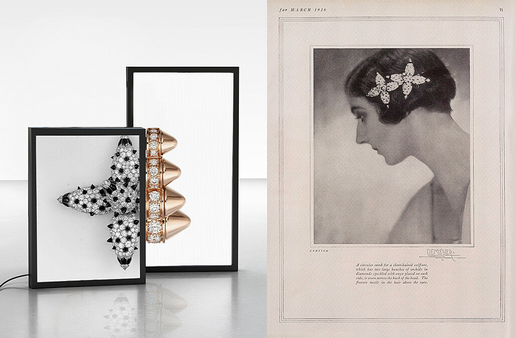 翻開歷史,卡地亞的飾釘元素最早可追溯於裝飾藝術風格正盛的20年代,文獻中紀錄著1925年在巴黎國際裝飾藝術及現代工藝博覽會上,一對以兩朵蘭花為造型設計的髮飾,以縞瑪瑙打造的尖錐形飾釘搭配鋪鑲鑽石,黑白相間的色系呼應當時的裝飾藝術風格,而立體的花卉造型則相當考驗珠寶工匠的鑲嵌功力,這件設計新穎的作品一面世後即一砲而紅,也令這種用錐形凸圓形裝飾球形結構,在日後被運用在許多卡地亞珠寶作品當中,並成為卡地亞的標誌性圖騰之一。