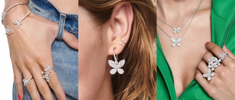 除了無可比擬的閃耀璀璨,以及栩栩如生的對稱美感,格拉夫蝴蝶系列珠寶的另一大特色是:單隻配戴或不同系列混搭疊戴都超級好看!妳可以只配戴一隻翩翩鑽蝶在指間,更能將格拉夫的不同鑽蝶戒指、吊墜、耳環和項鏈等隨心搭配穿戴,展現出屬於妳的獨到時尚風采。